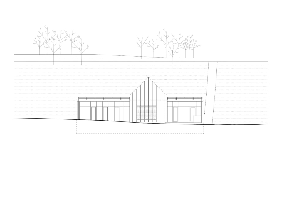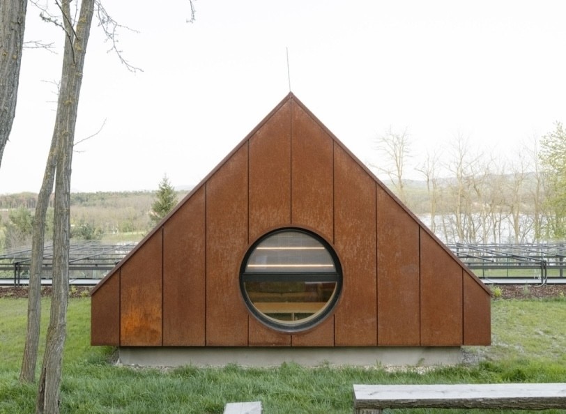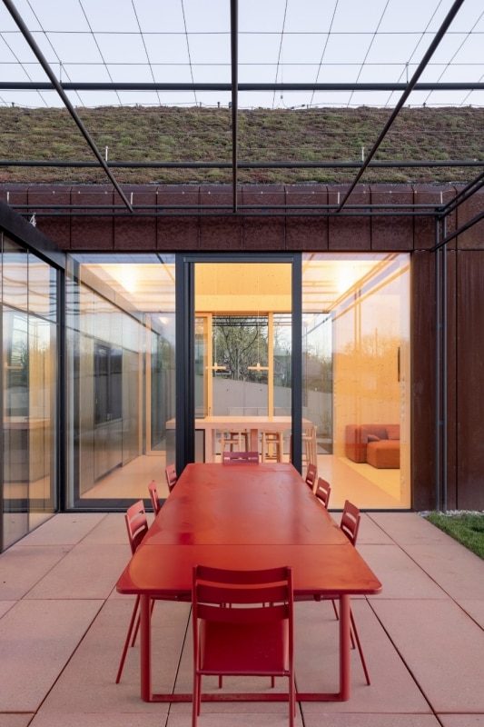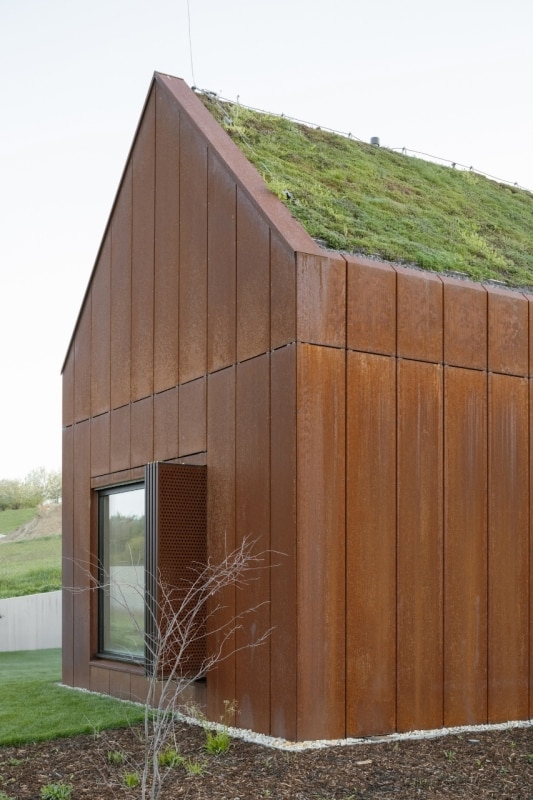 Once outside, the palette shifts again: the night zone blends in with reflective glazing and green roofs dissolving into the slope, while the day zone asserts itself through metal – light pergolas and expansive corten surfaces.