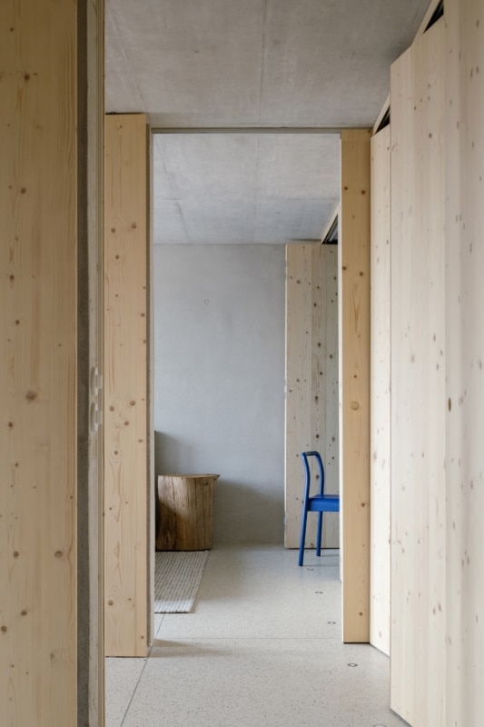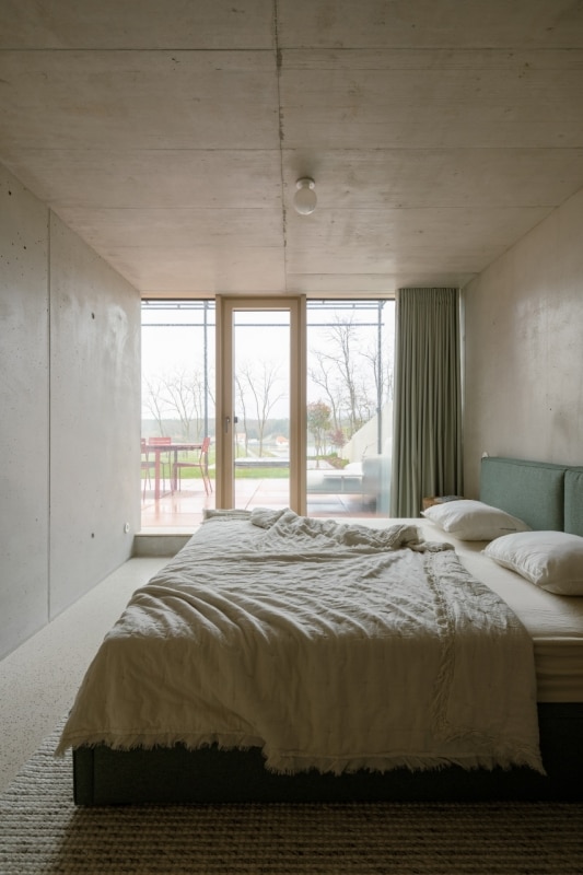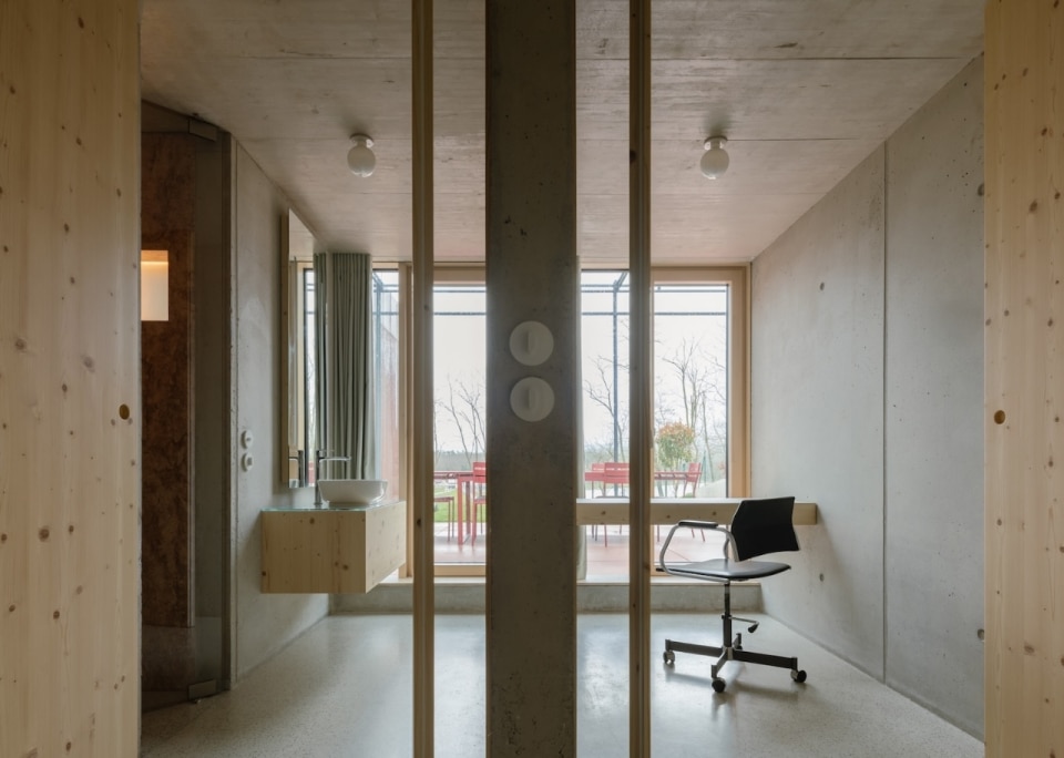 Very quickly, the house establishes a “landscape of surprise.” Its seemingly intimate interior in fact “escapes” in every direction: through the glazed walls of the bedrooms, the living room’s transparency onto a patio nestled in the hillside, and the visual continuity between levels and openings in the living-studio space. It is an effect reminiscent of the Raumplan in Adolf Loos’s houses – and Vienna, after all, is not far away.