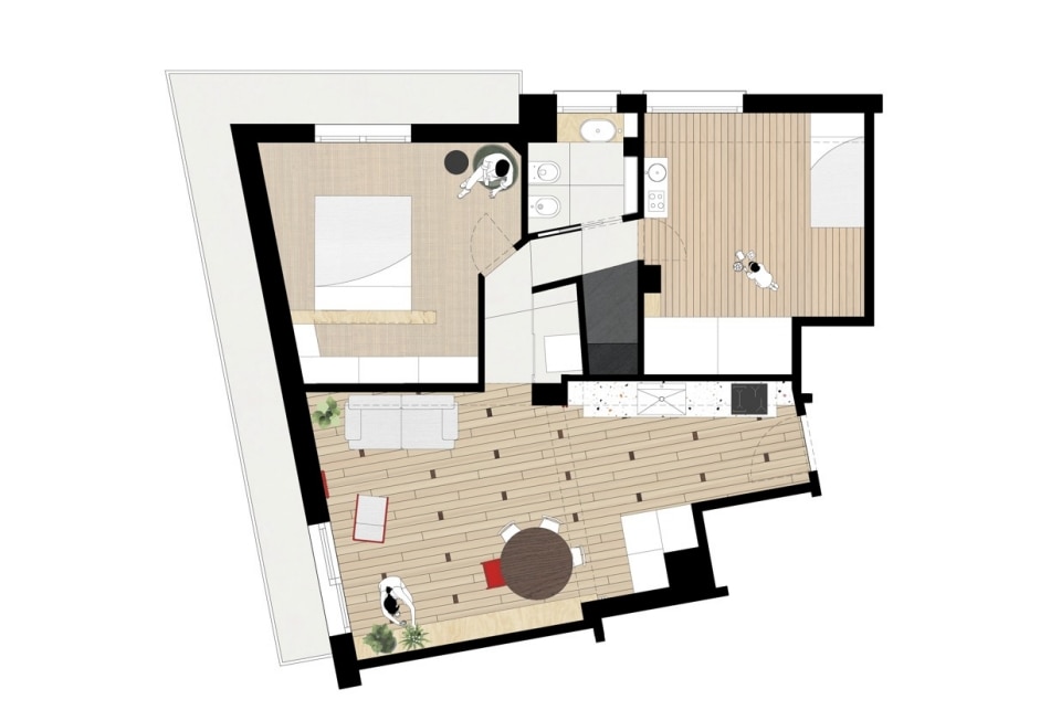 A trapezoidal floor plan, a large L-shaped terrace surrounding the home from the living room to the bedroom and a blend of industrial and postmodern styles are just some of the features that define this 70 m² apartment in Bologna. The renovation was carried out by Cima Studio, which created Casa B. V. Not for a private client, but for their own use: the architects chose this space in which to express their personal aesthetic and, above all, to live.