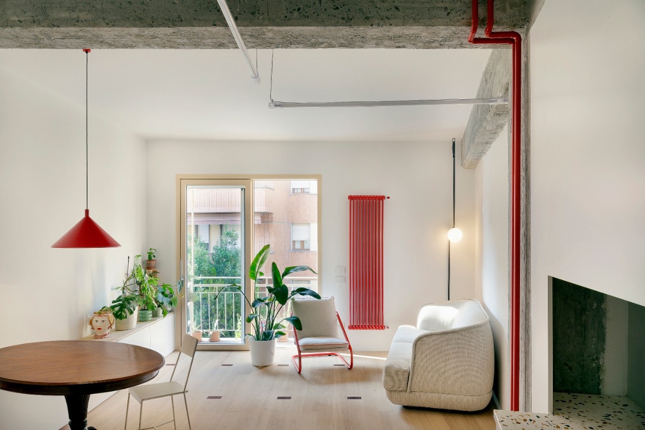 This is demonstrated by the decision to disrupt the regularity of the floor plan to create a 'lived-in' hallway and by the use of a single bright colour, red, for the heating sources: the clearly visible heating pipes running along the wall, the radiator in the living room, the conical light on the table and a small detail on the kitchen sink. The concrete beams and pillars are exposed and, in contrast to the red details, give the space an industrial design feel with echoes of Memphis. This is also evident in the terrazzo flooring in the kitchen.