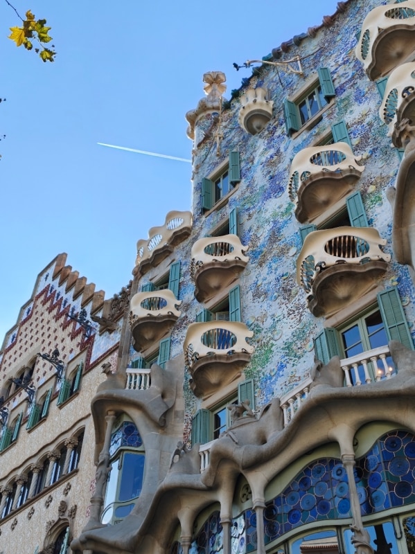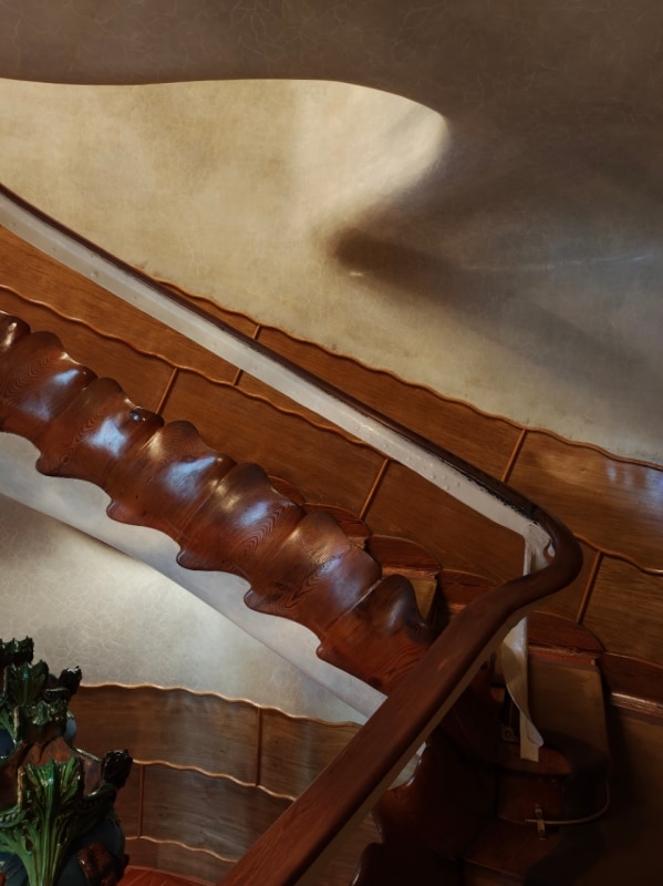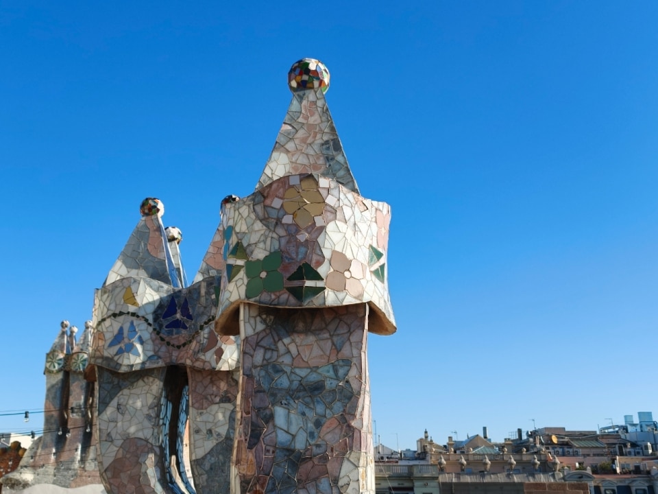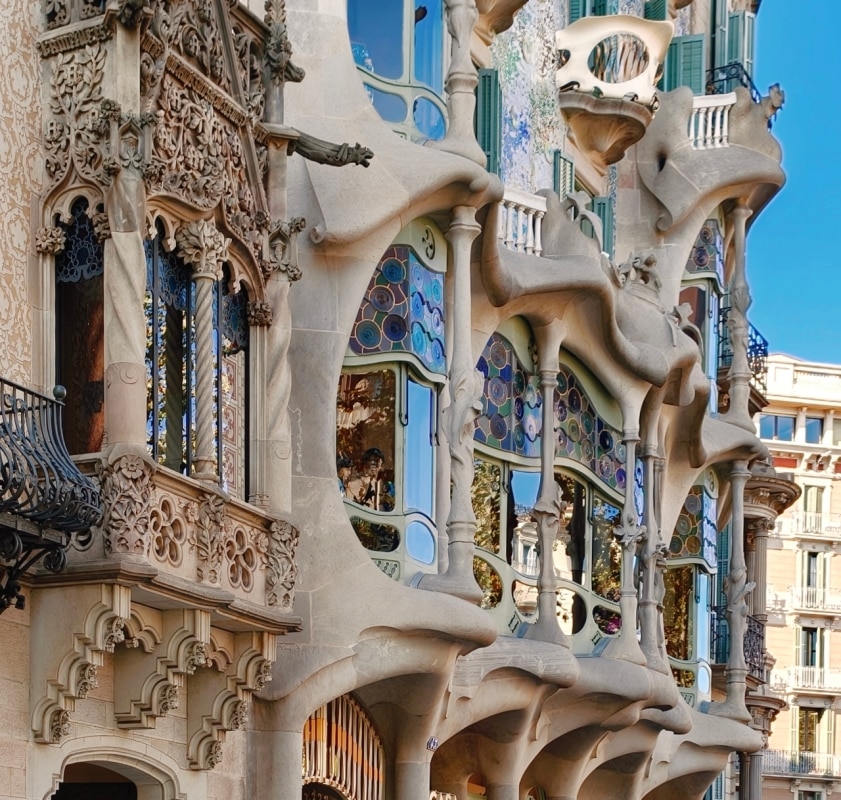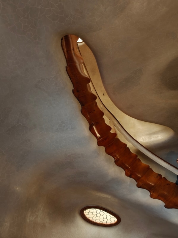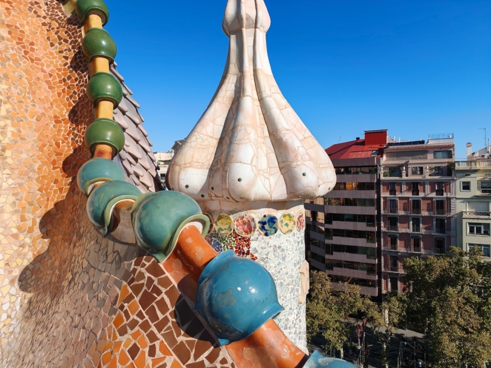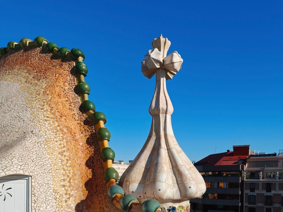 Its vertebral spine of carved wood becomes the main staircase, flowing seamlessly into the undulating vestibule ceiling, then emerging again at the top where the “dragon” turns into a sculptural roof clad in iridescent ceramic scales. The spine reappears as a chain of colorful globes along the roofline. This decorative torrent spills over the façade, where bone-like columns and mask-shaped balconies have earned it the nickname “House of Bones.” Is it the dragon slain by Saint George, its victims’ bones below, or the waves of the Mediterranean crystallized in ceramic, as Salvador Dalí once suggested? The answer remains open, and endlessly reinterpreted.