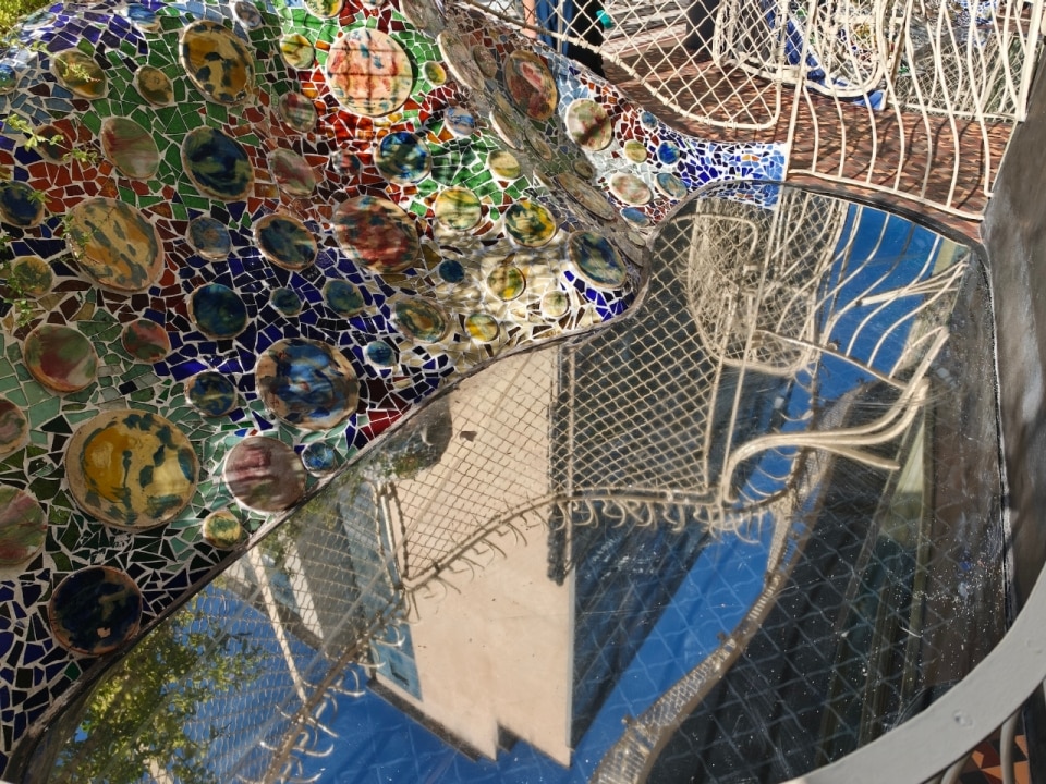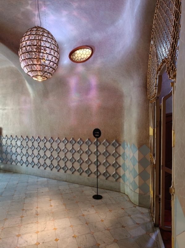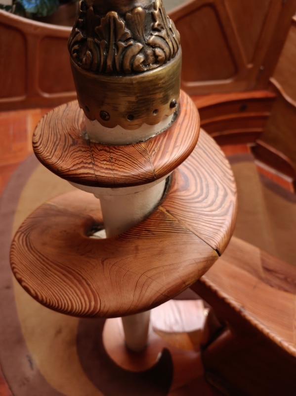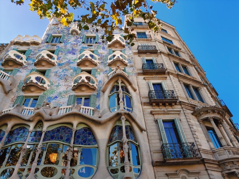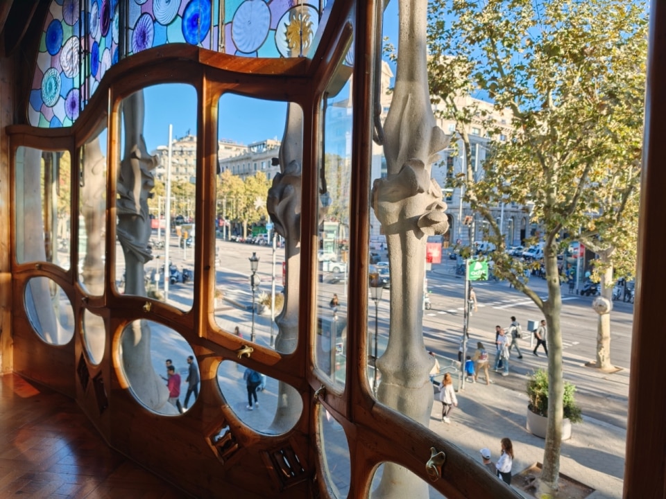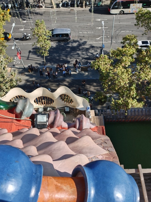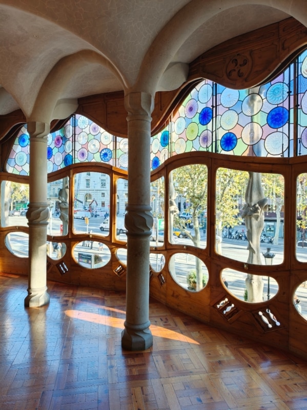 Its vertebral spine of carved wood becomes the main staircase, flowing seamlessly into the undulating vestibule ceiling, then emerging again at the top where the “dragon” turns into a sculptural roof clad in iridescent ceramic scales. The spine reappears as a chain of colorful globes along the roofline. This decorative torrent spills over the façade, where bone-like columns and mask-shaped balconies have earned it the nickname “House of Bones.” Is it the dragon slain by Saint George, its victims’ bones below, or the waves of the Mediterranean crystallized in ceramic, as Salvador Dalí once suggested? The answer remains open, and endlessly reinterpreted.