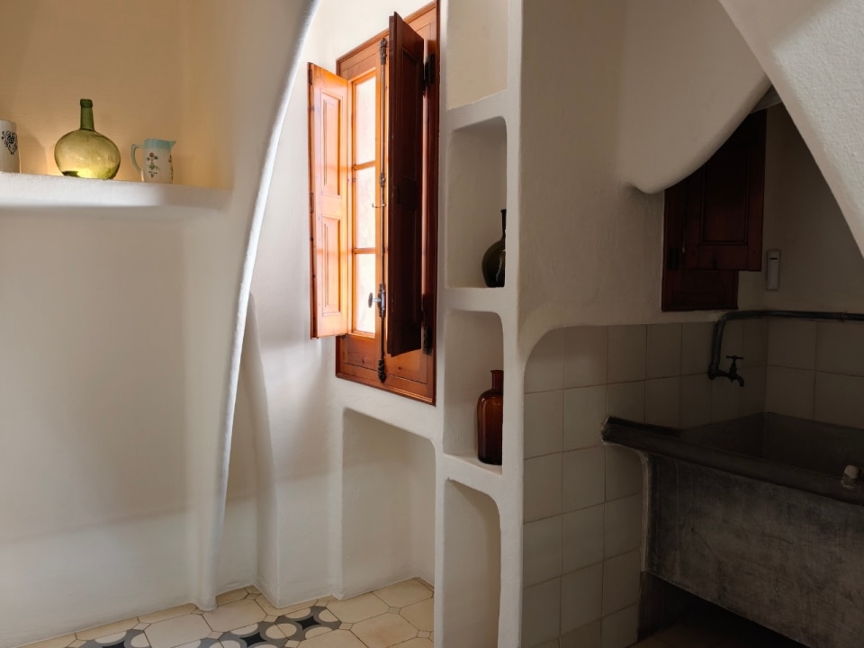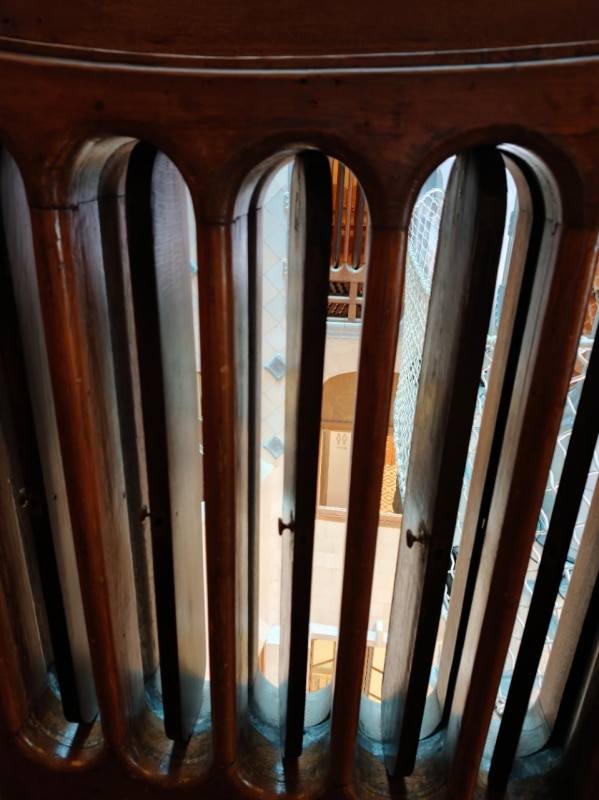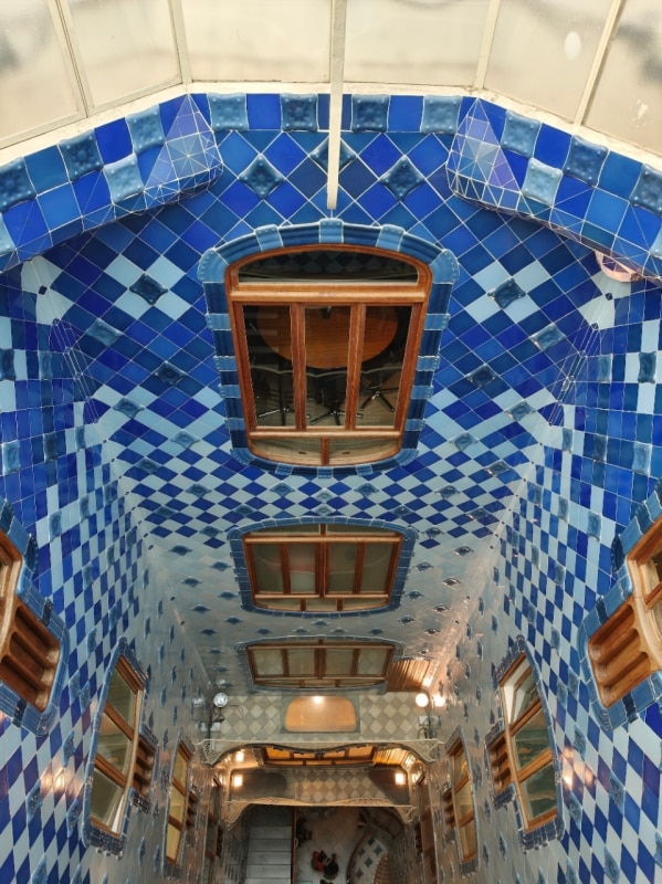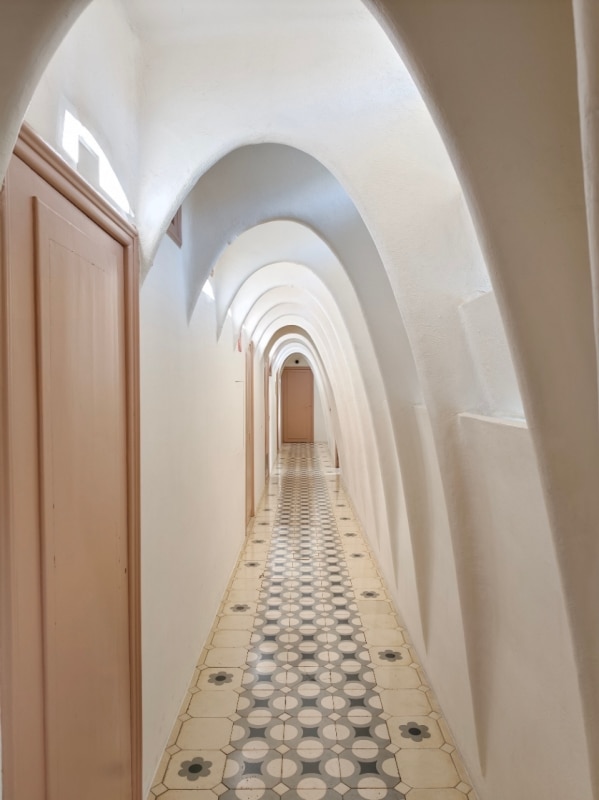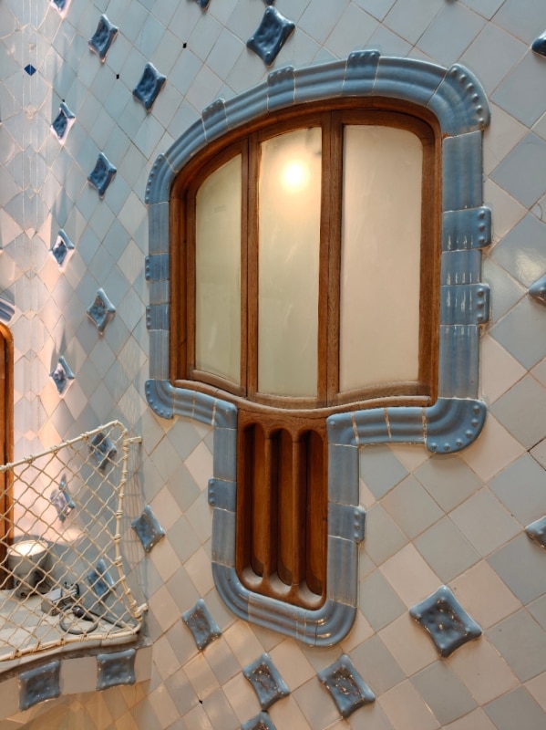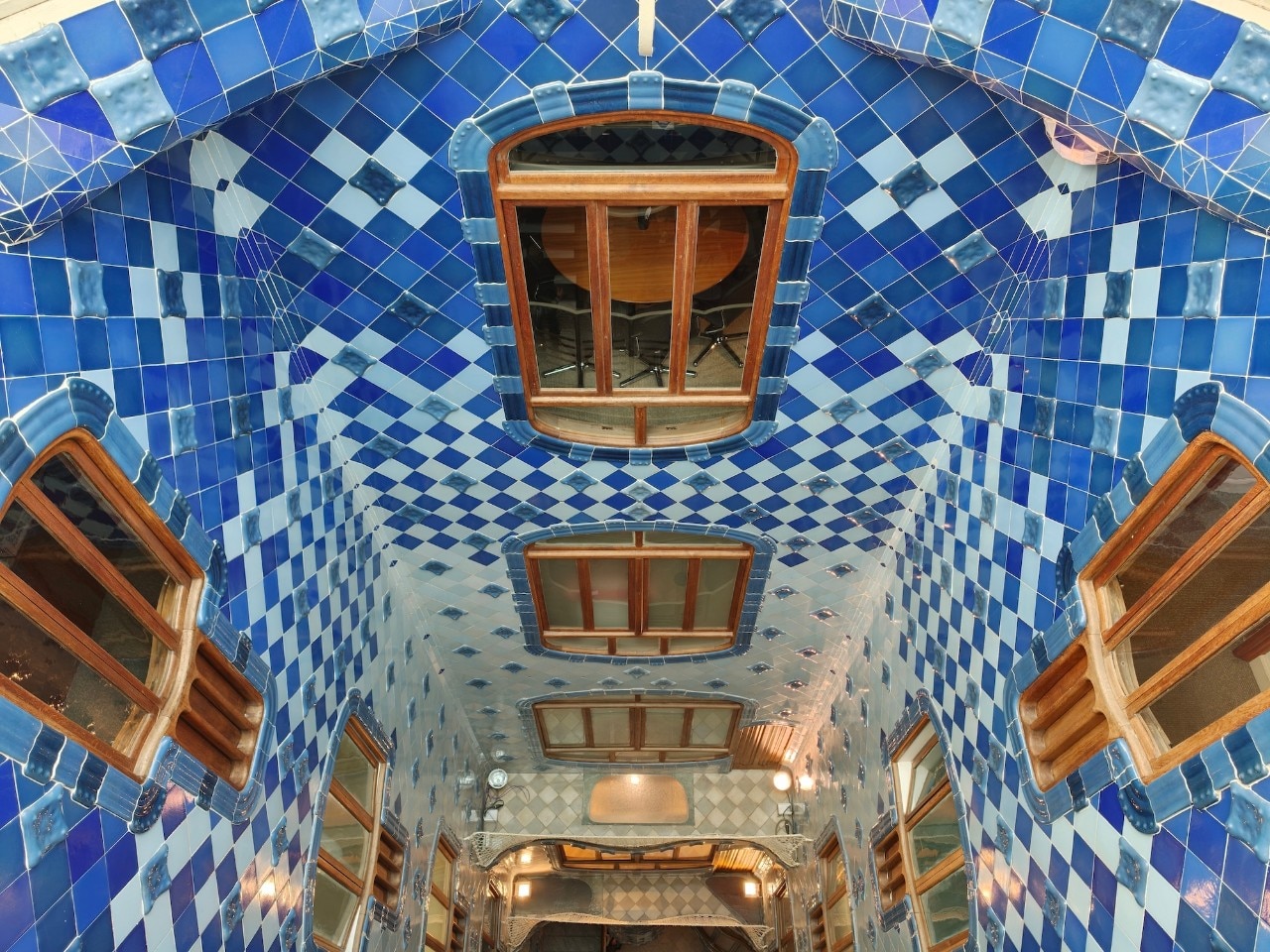 The grand sculptural window of the main salon is both a masterpiece to behold, from inside and out, and a statement of the family’s social status. The dazzling ceramic lightwell at the heart of the building was born from the expansion of an existing shaft: its tiles shift gradually from pale to deep blue as they ascend toward the brighter upper floors. The mushroom (or skull-) shaped windows expand to capture natural light, while the wooden shutters below them allow manual control of cross-ventilation, exploiting the stack effect for natural airflow. Even the high, white-painted Catalan vaults beneath the roof contribute to this passive ventilation system, aerating the service spaces.