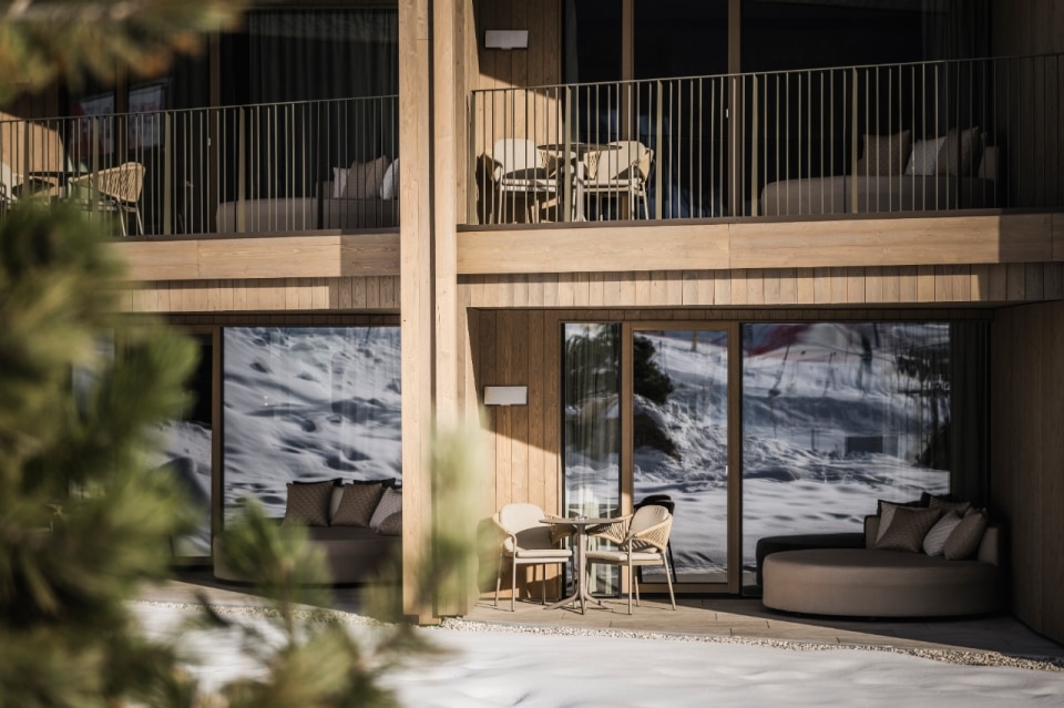 In defining the new Cendevaves Alpine Silence Hotel, the choice of material is not only technical but cultural. At high altitude, where matter must dialogue with nature, Gamper reduces architecture to its primary elements: “in a landscape like this, the essential building materials are ultimately only two: natural stone and wood.” Local dolomite shapes the retaining walls, while larch — resistant, durable, and warm — clads the façades and roof structures.