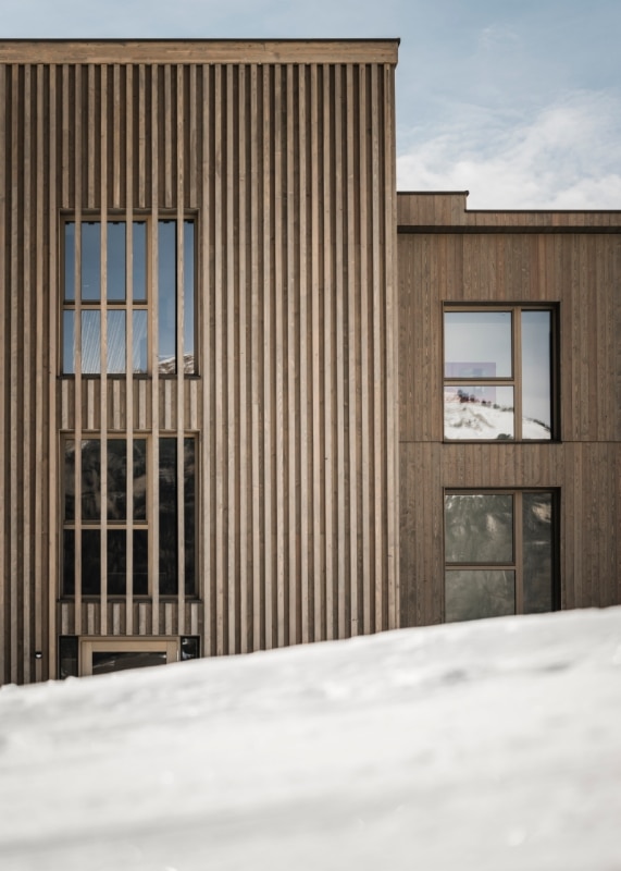 There is also another fundamental aspect: although specialized labour is necessary to work it properly, wood makes fast construction possible thanks to prefabrication — an invaluable quality in Alpine contexts. In this respect, the South Tyrolean company Aster, specialized in timber construction, played a decisive role as it oversaw the project in all phases, from technical planning to prefabrication and final assembly.