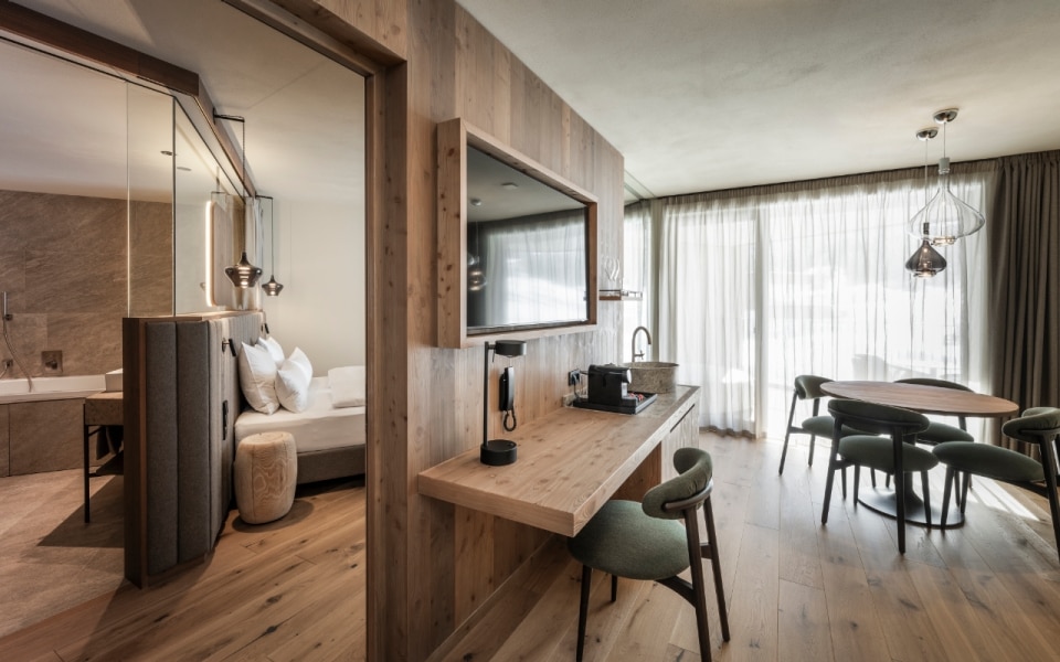 Expanding a historic building means confronting memory, proportions, and identity. In this project, the original 1959 building — with its traditional plastered architecture and double-pitched roof — remains intact and “still constitutes the core of the complex,” Gamper tells Domus. From the central body, a witness of over sixty years of activity, two wings unfold with curved footprints, designed to accommodate contemporary functions without distorting the historic structure: “the first, built in the 1990s, was raised as part of this project and today hosts a large glazed wellness area; the second is the new wing with suites and guest rooms, completed by a fully glazed lounge with a breakfast room,” explains Gamper.