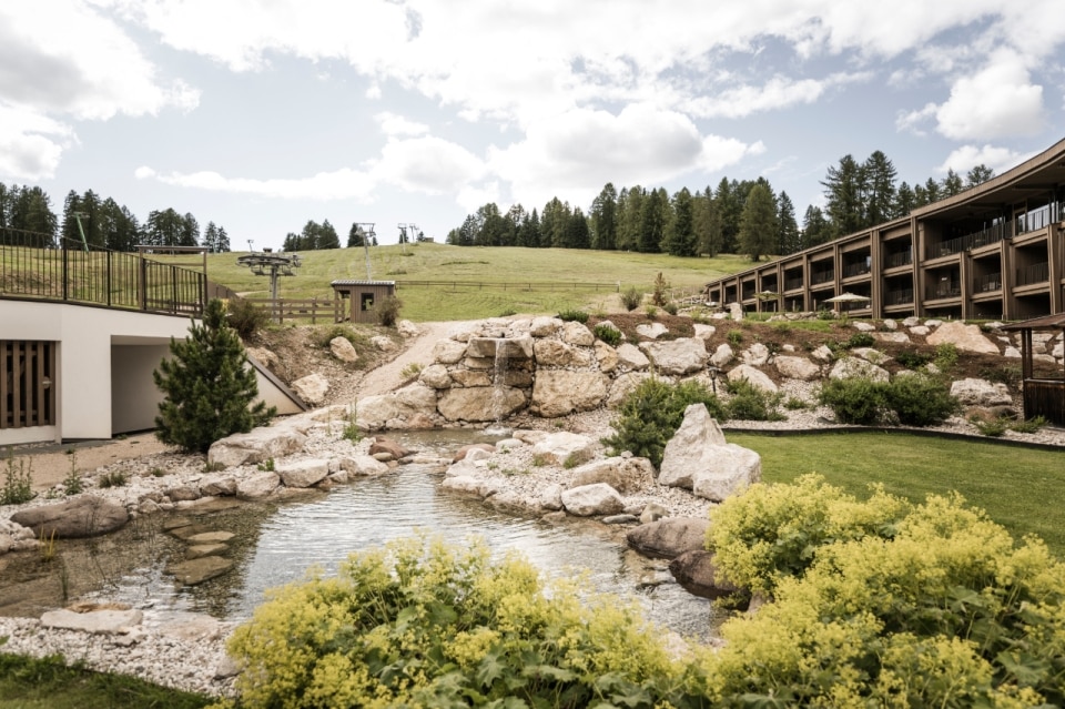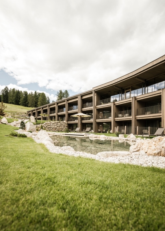 The architectural language of the two wings is openly contemporary: it does not seek to adapt to the aesthetic of the original building because “the new intervention does not compete with the existing one”; rather, it draws inspiration from the Dolomite landscape, which also informs the layout of the complex around a central green space animated by a natural swimming lake.