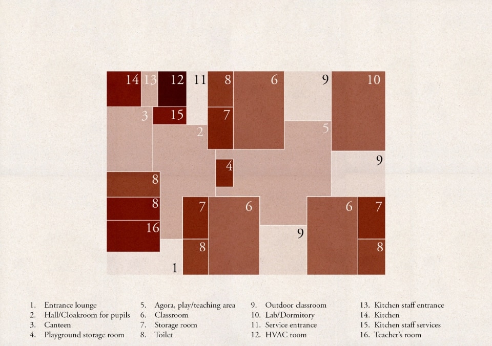 While the exterior appears monolithic, the structure is carved with patios dedicated to outdoor learning directly connected to the classrooms. At its heart lies a central space conceived as an “agora”—a communal place for social interaction and informal learning—around which the various blocks are arranged like buildings surrounding a public square.