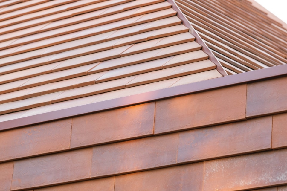 Set within a landscaped park, the compact cluster of buildings is wrapped in vermilion terracotta shingles that stand out vividly against the greenery. Three truncated pyramid-shaped volumes, echoing the area’s vernacular architecture and housing the classrooms, rise above the rectangular base. Their color and form evoke the iconic Casa das Histórias Paula Rego museum in Cascais, designed by Eduardo Souto de Moura.