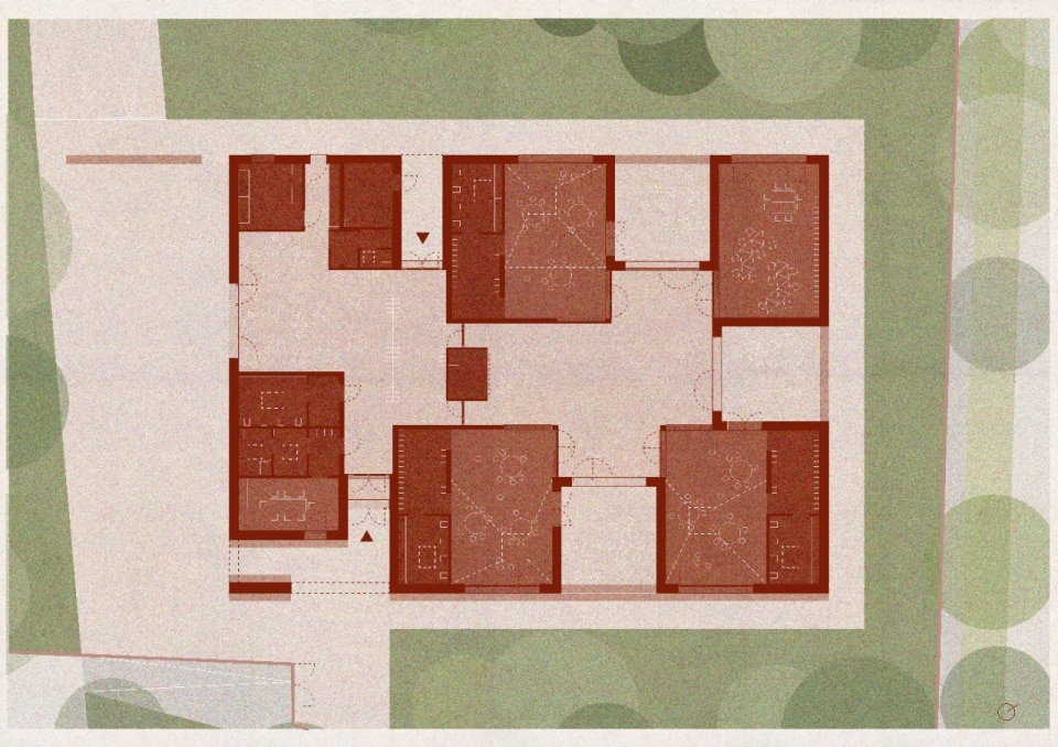 Visual connections and layers of transparency blur the distinction between indoors and outdoors. From the central shared space, one can glance into the classrooms, the patios, and further out into the garden. Meanwhile, each classroom opens upward toward the sky through a zenithal light chimney, encouraging children’s curiosity and sense of discovery.