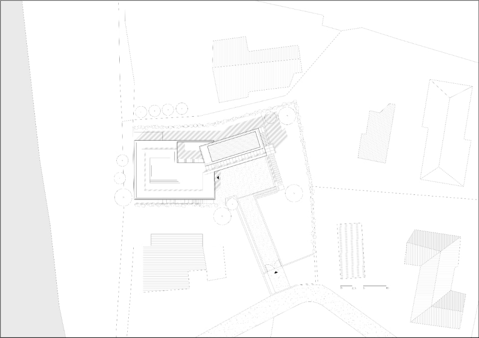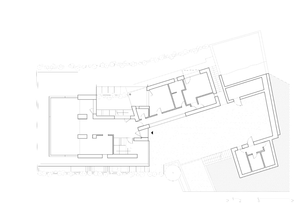 The complex is a cluster of essential volumes, arranged on two levels, that lie on the terrain, nestling into the slope: a main body, projected towards the lake, housing the common areas; a second, set-back volume, for private rooms; and a third, below ground, in extension, enclosing the entrance courtyard. On the roof, the solarium and swimming pool offer spectacular views of the lake and mountains.