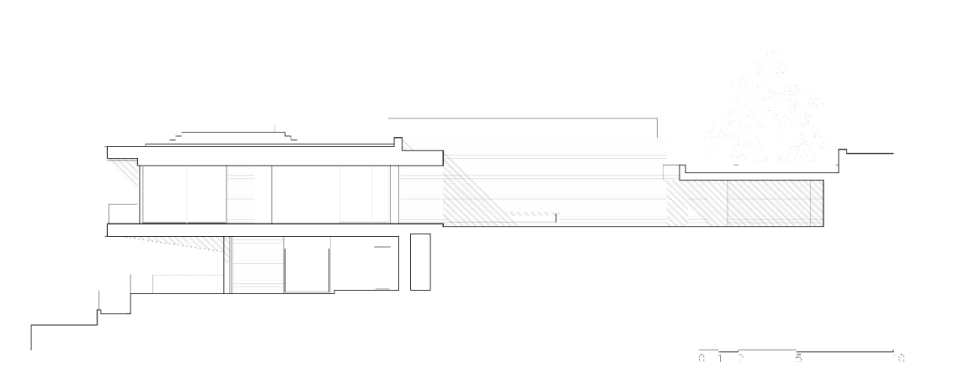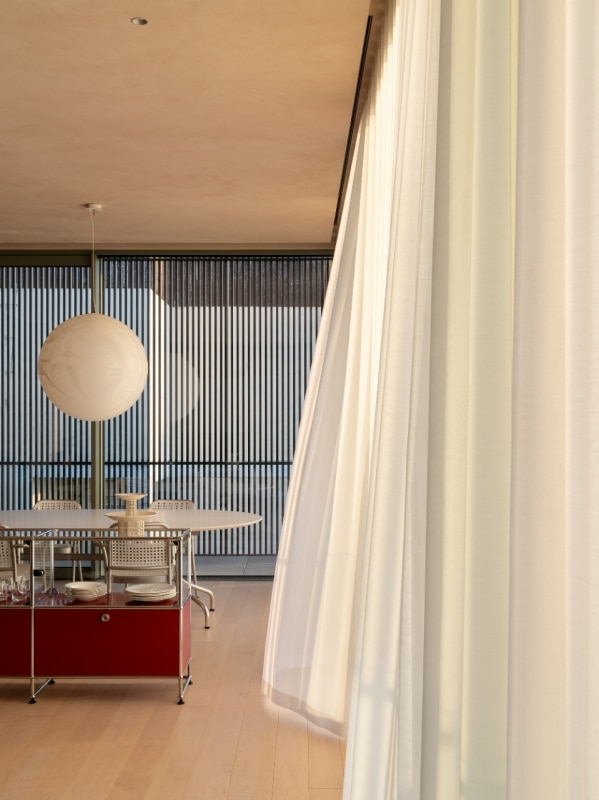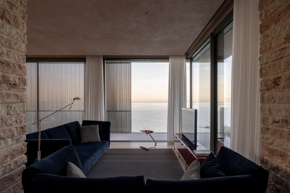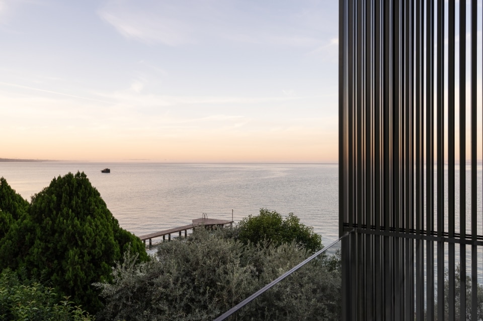 Towards the lake, the massive consistency of the construction dissolves into the shell of the main volume, where large windows open onto a perimeter loggia, screened on the outside by movable metal shading panels: a backdrop protecting domestic privacy which, depending on the needs, gradually opens up to the landscape, creating a diaphanous halo around the house and ensuring control of radiation and introspection.
