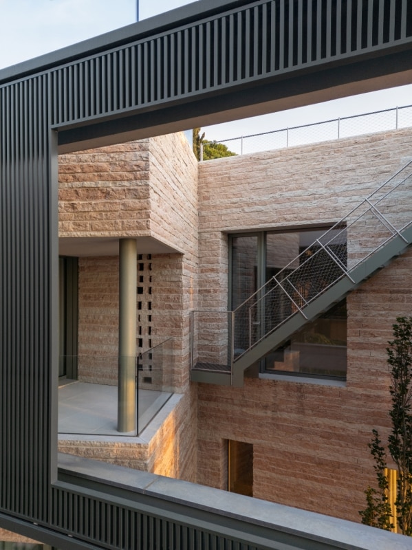 The dualism between material accents and vanishing effects enhances the composite character of the building. On the outside, the pink Lessinia stone cladding, laid on the side walls and on the base in horizontal bands with a split finish, recalls the stratifications of the hillside rock, vigorously rooting the construction in the colours and textures of the place.