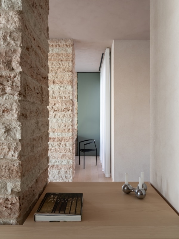 Inside, the material dialectic continues in the soft-toned stone cladding of the walls, and the domestic warmth brought to the rooms with the exposed wood finishes and floors, while the light filtering through the windows reverberates on white curtains and essential furnishings, giving the composition a radiant and peaceful character.