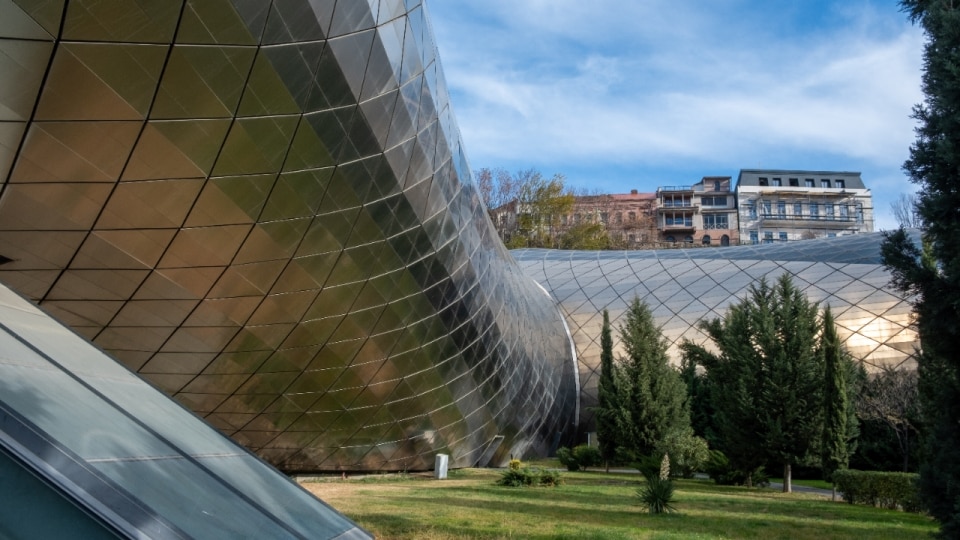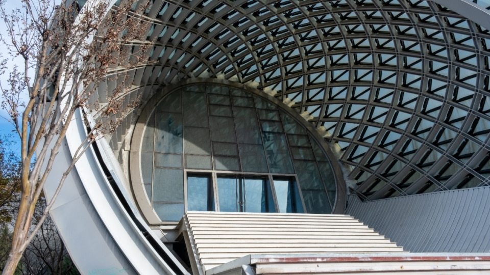 In reality, as Nino Tchatchkhiani, founder of the Tbilisi Architecture Archive, explains, “the building formally reprises ideas from the proposal Fuksas presented for the competition for the Hermitage Museum in Vilnius,” and it was not truly designed to be site-specific. The project occupies a 10,000-square-metre site and consists of two soft, differently shaped elements in reinforced concrete and steel, clad in steel and glass panels, connected as a single body by the retaining wall against which they rest. Costing 40 million euros, it was meant to accommodate 550 seats, but the interior was never completed and the auditorium has always remained empty and closed. Despite retaining a controversial kind of beauty, today it lies in the park next to a car park, like a large metal carcass. It nevertheless remains the symbol of a Georgia that, especially after the 2003 revolution, had begun to dream of a path toward European integration.