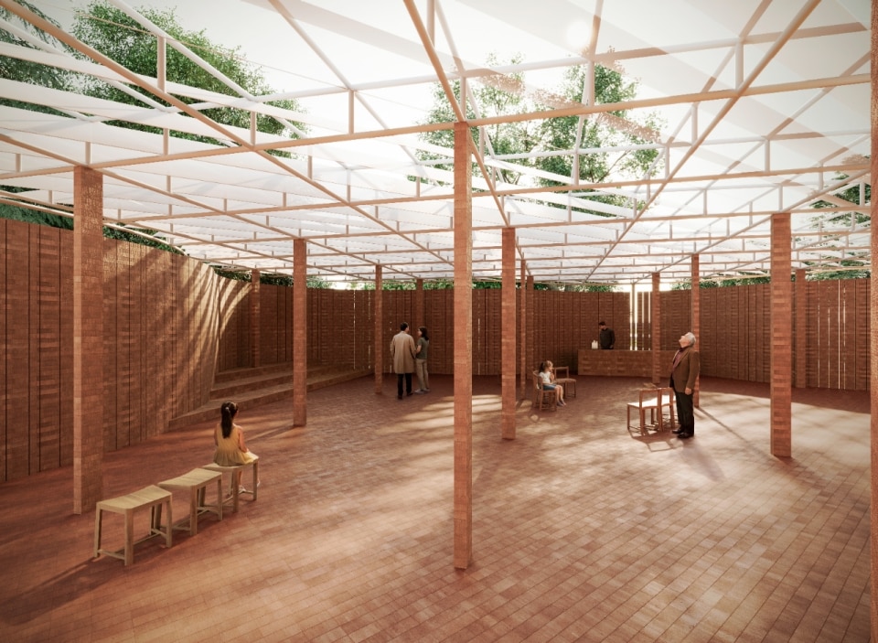 While the first wall follows a linear path, the second—on the opposite side—adapts to the outline of the surrounding trees, avoiding interference with the existing vegetation. The translucent roof, which allows glimpses of the sky, is supported by a regular sequence of brick pillars that echo the material quality of the walls. Light filters in from every direction, creating an extremely permeable environment. It almost naturally evokes the work done in 2025 by Marina Tabassum with her Capsule in Time or, going further back, Sou Fujimoto’s 2013 pavilion—who, incidentally, has been invited this year to act as a consultant by the Serpentine Galleries.