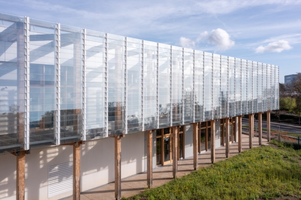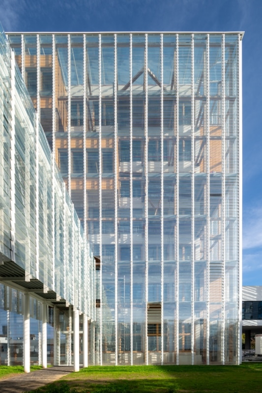 The Research Green Tower—the emblematic tower of the campus, where research spaces and faculty offices were previously confined—becomes the ultimate symbol of this transformation. In the new project, the building is wrapped in a bioclimatic façade composed of double wooden pillars. In addition to regulating solar gain and generating a virtuous climatic cycle, the gallery incorporates a staircase and terraces, both public and private, available to faculty and students. Circulation spaces are thus transformed into opportunities for collective study and learning.