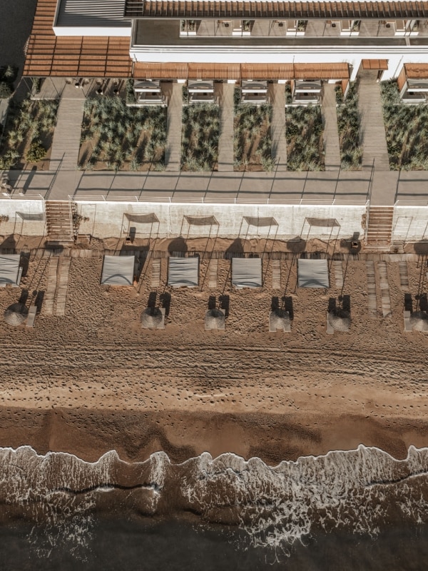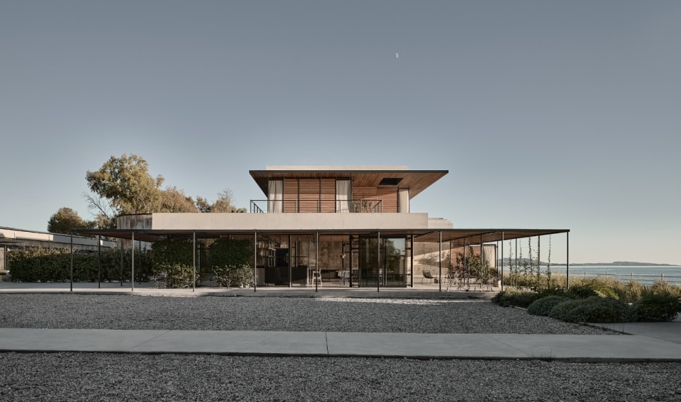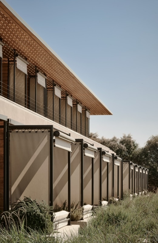 K-studio is carrying forward the enhancement of an early 1900s distillery on the western coast of the Peloponnese, which the same architects had already adapted for reuse in 2019. The idea was to convert the starkly Brutalist complex—made up of two parallel concrete blocks and two imposing central silos—into a hotel that weaves together industrial memory and Ionian Dolce Vita. Originally, the project involved transforming the concrete fermentation tanks into a sequence of sea-view guest rooms, while the silos, reflected in a dramatic water mirror, were converted into shared spaces. With the latest intervention, the linear seafront block has been extended and eight new suites have been added. A lightweight structure of wood and metal, with expansive glazed surfaces in keeping with the language established in the earlier phase, rests lightly upon the massive concrete body of the existing building. It echoes the original structural rhythm while softening its gravity through a minimalist vocabulary that subtly nods to nautical atmospheres.