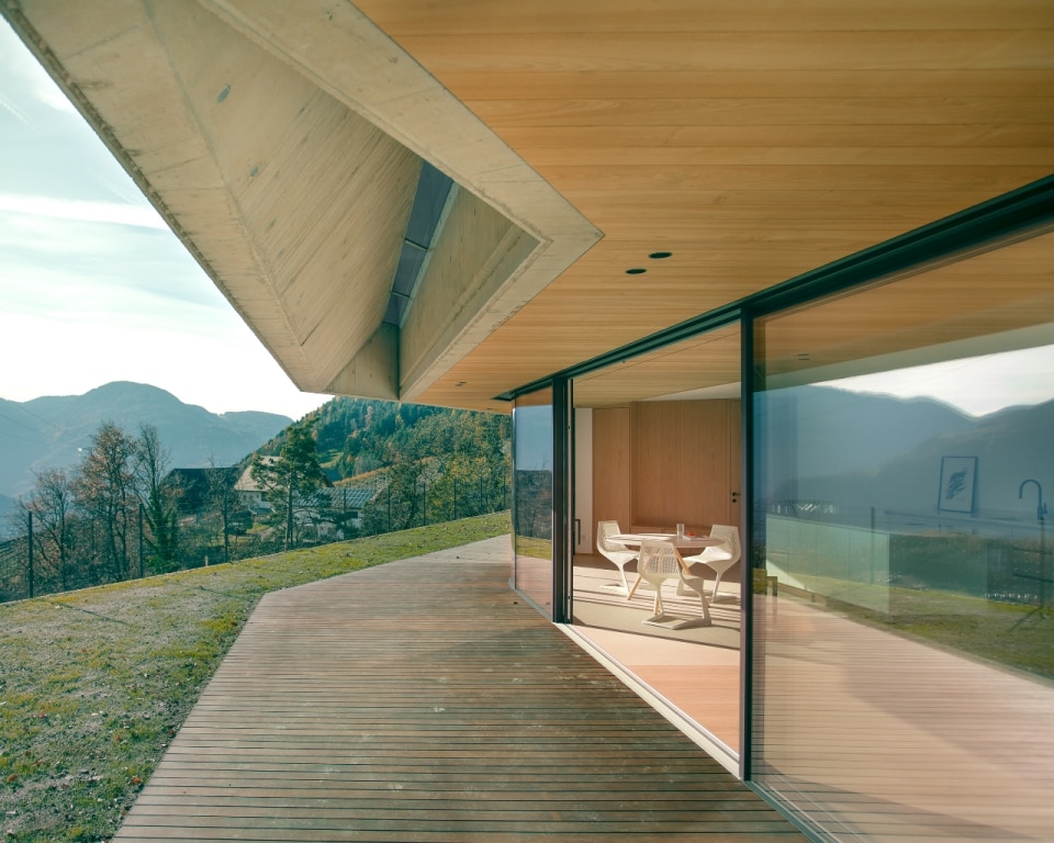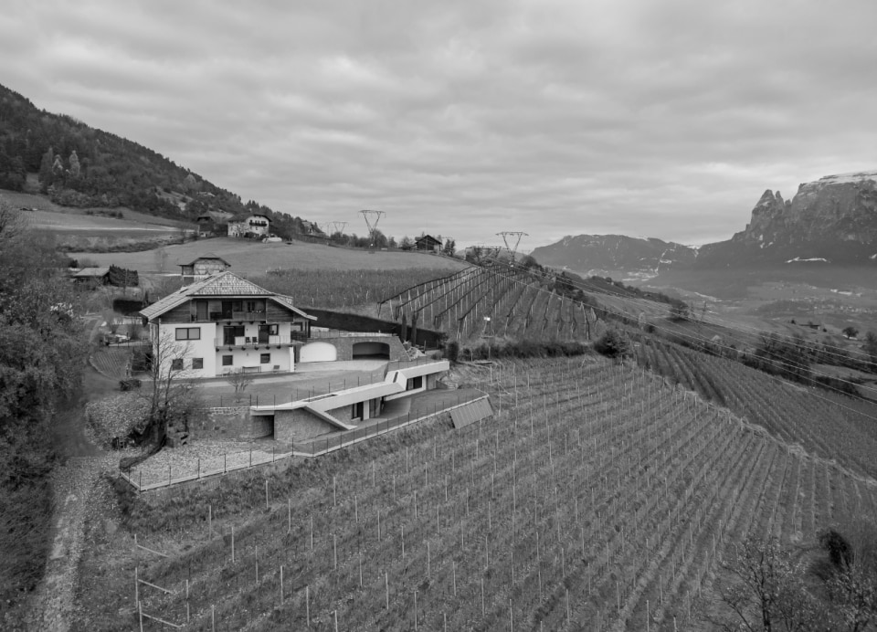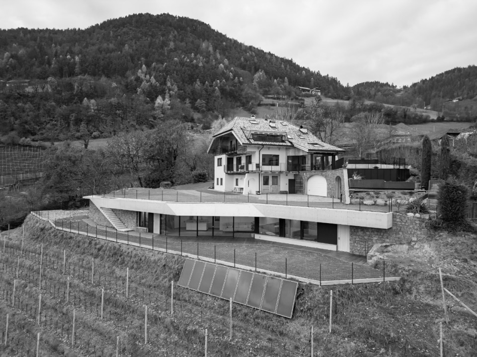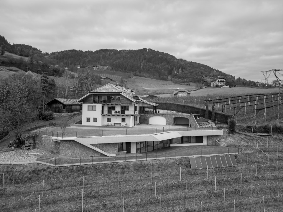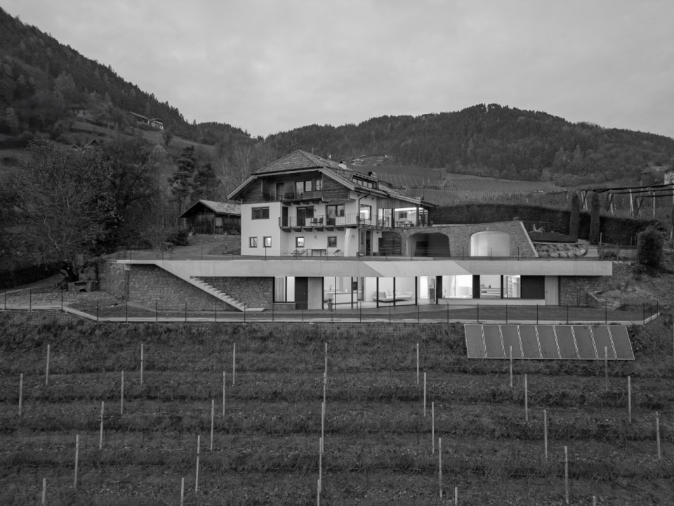 Set in a mountain landscape dotted with rural buildings, Messner Architects has completed an extension to a 1970s house that boasts a clear and unmistakable contemporary style. The new single-storey structure, located below the existing dwelling and connected to it at ground level, is nestled into the slope and offers unobstructed views of the Dolomite scenery to the south and south-east. The new structure is almost hidden, revealing itself through vertical partitions in local stone that are interrupted by large glass surfaces. A projecting exposed concrete roof, designed to control solar radiation, crowns the structure and draws a sinuous line that winds through the vineyards, giving the composition a dynamic character with deconstructivist references. Inside, the warm texture of the chestnut and oak wood cladding on the floors, ceilings and doors contrasts with smooth plastered surfaces, ceramic cladding and monochrome furnishings.