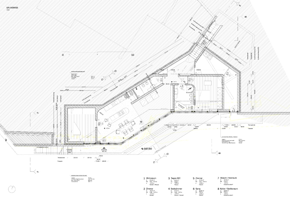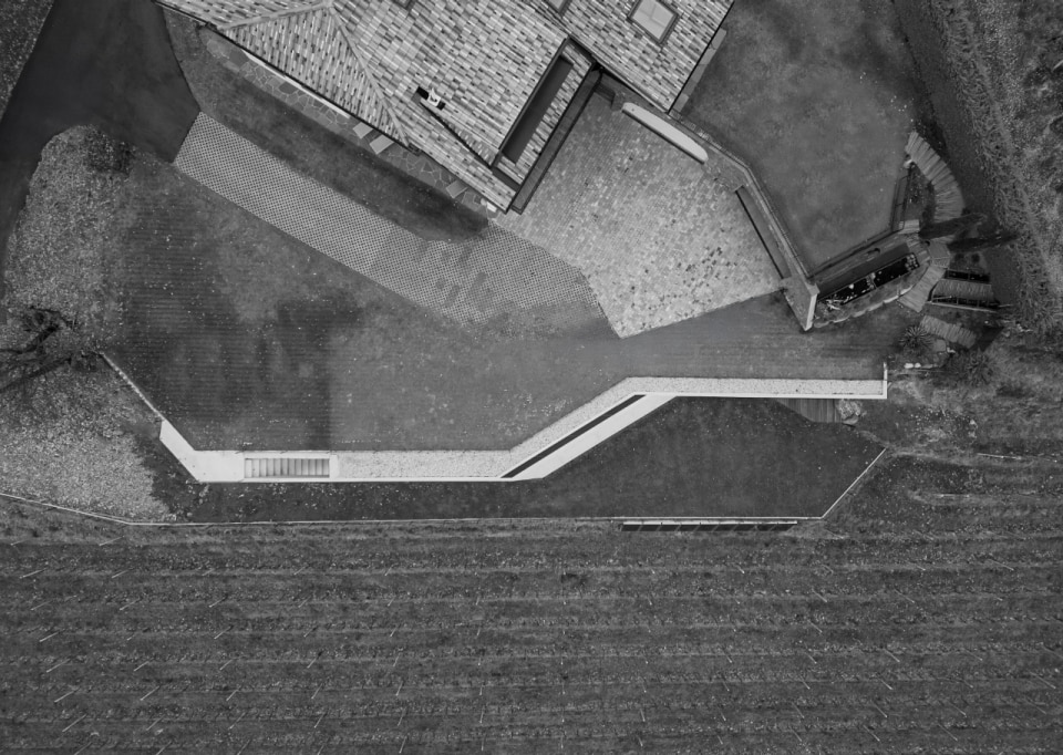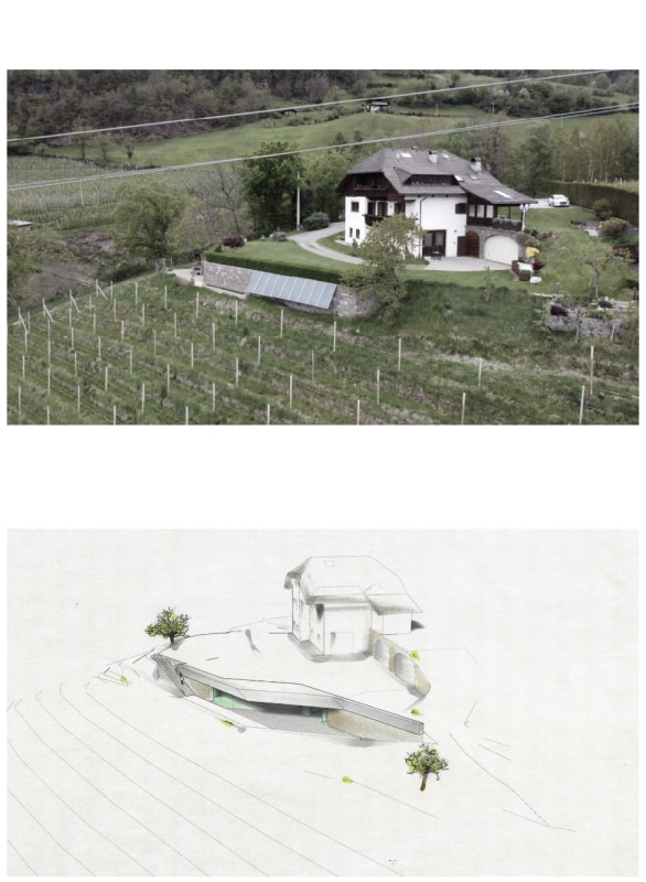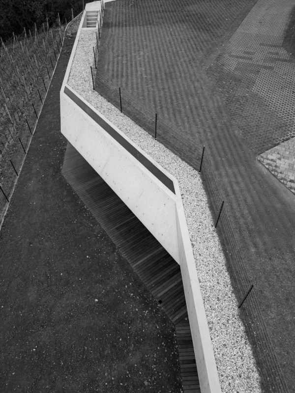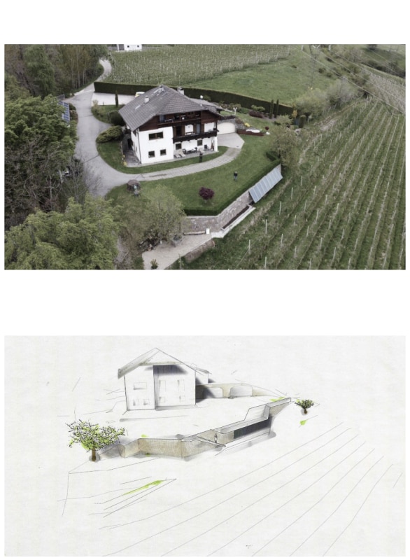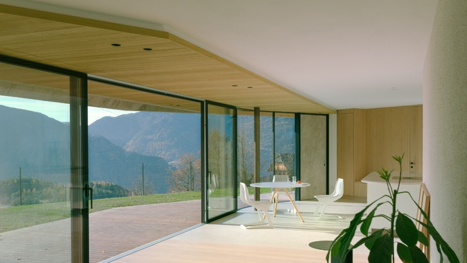 Set in a mountain landscape dotted with rural buildings, Messner Architects has completed an extension to a 1970s house that boasts a clear and unmistakable contemporary style. The new single-storey structure, located below the existing dwelling and connected to it at ground level, is nestled into the slope and offers unobstructed views of the Dolomite scenery to the south and south-east. The new structure is almost hidden, revealing itself through vertical partitions in local stone that are interrupted by large glass surfaces. A projecting exposed concrete roof, designed to control solar radiation, crowns the structure and draws a sinuous line that winds through the vineyards, giving the composition a dynamic character with deconstructivist references. Inside, the warm texture of the chestnut and oak wood cladding on the floors, ceilings and doors contrasts with smooth plastered surfaces, ceramic cladding and monochrome furnishings.