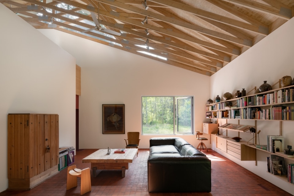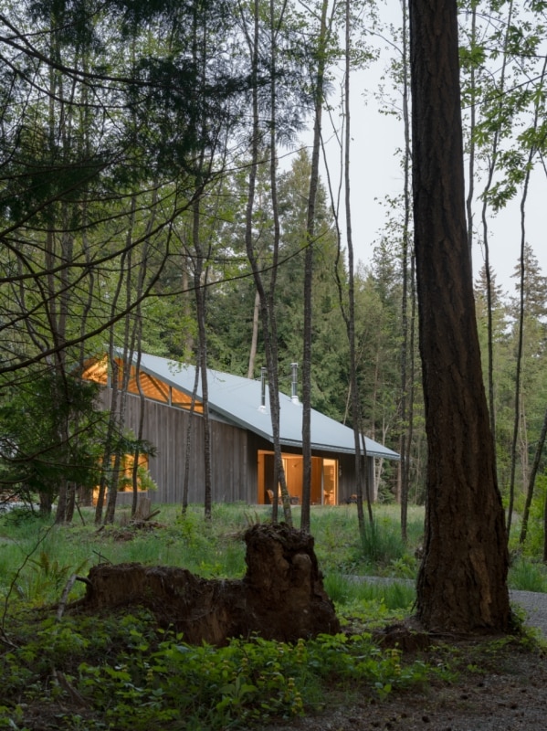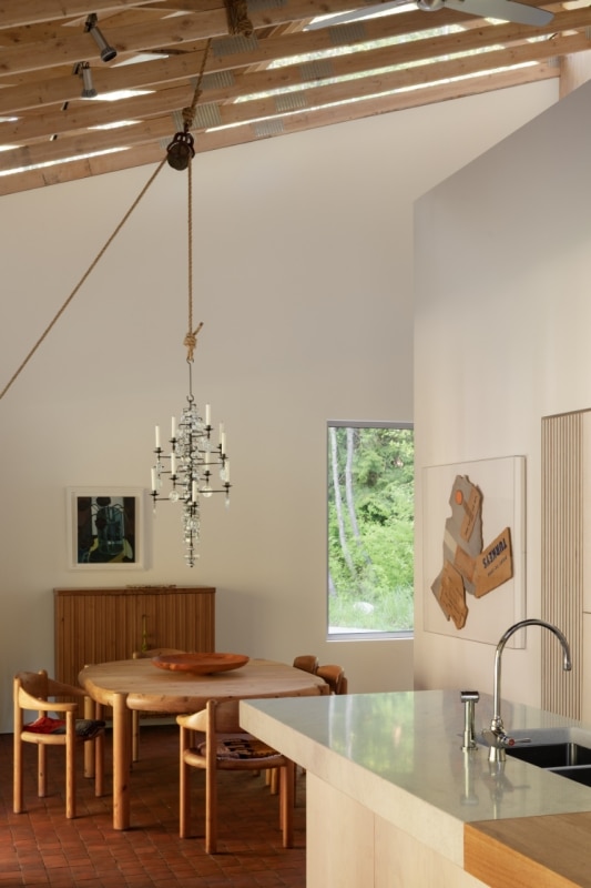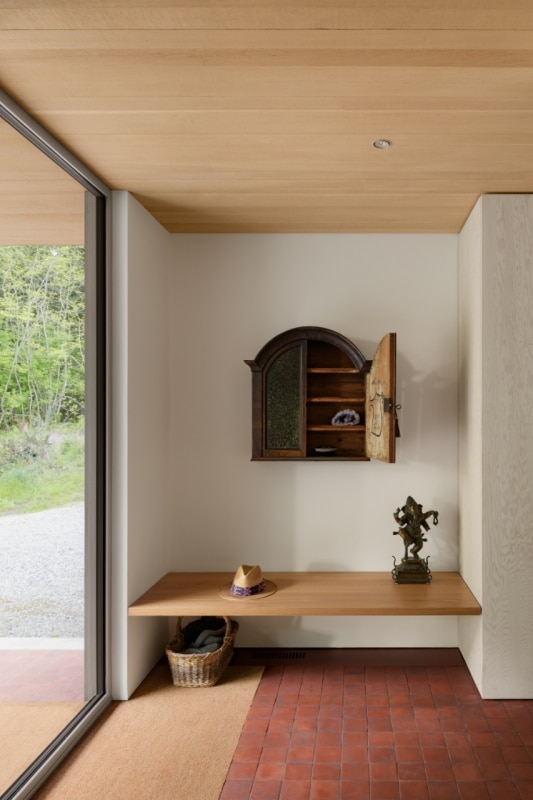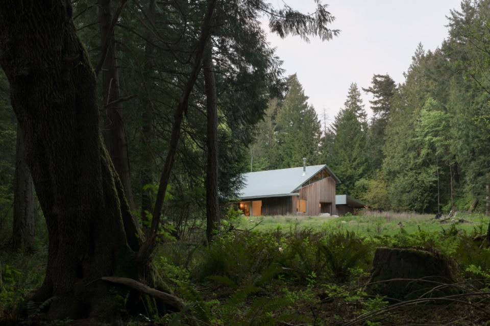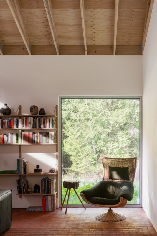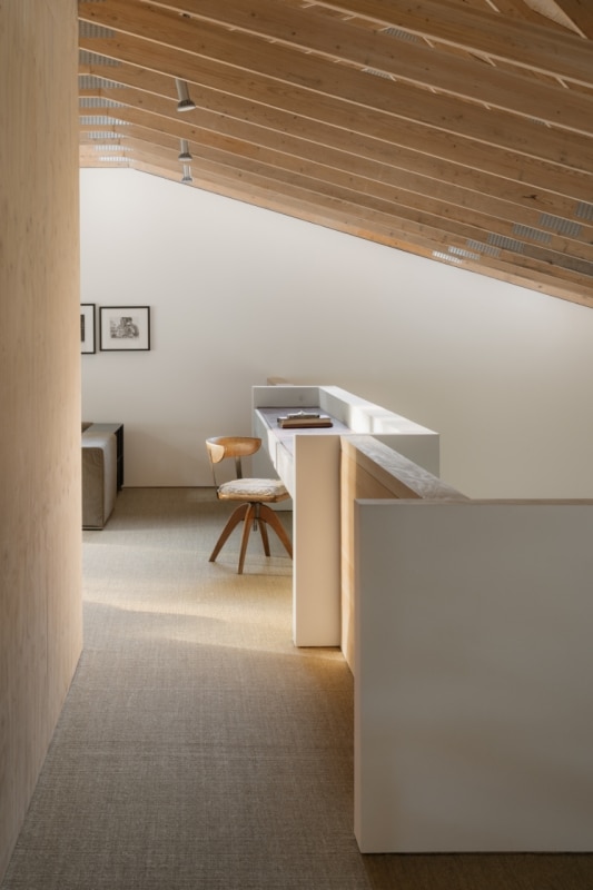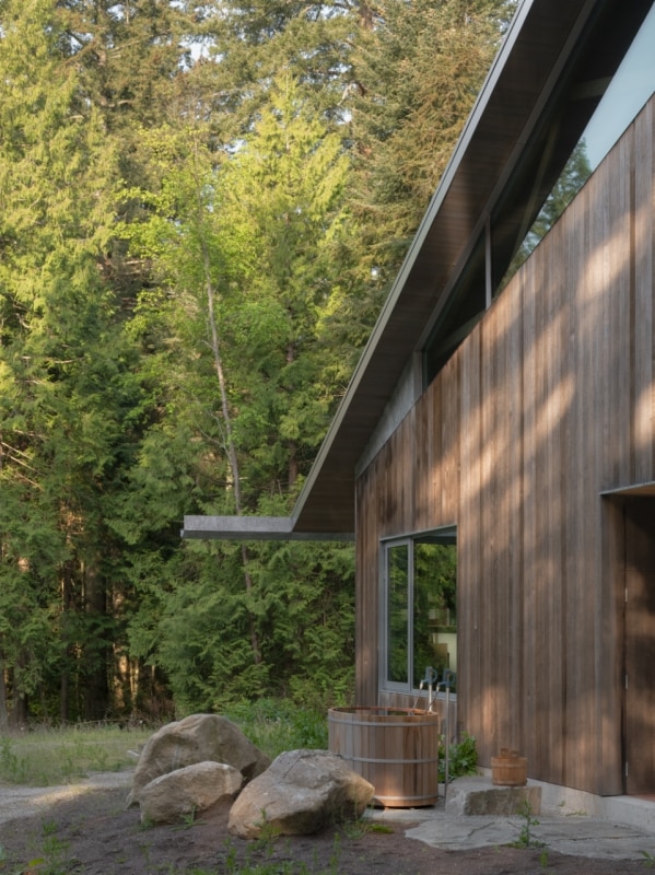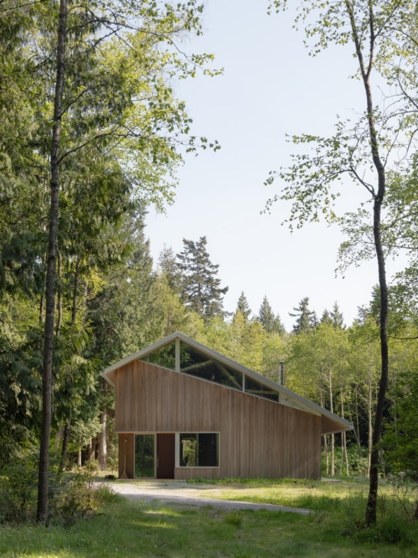 Point Roberts is a U.S. exclave located in Washington State that cannot be reached by land without passing through Canada. Scott and Scott have designed a retreat-like home here, set within a clearing and intended for short stays in an area that has largely become a holiday destination. The project centres on the extensive and thoughtful use of wood. Exposed structural beams form a dense truss system that is visible across both levels. The ground floor is dedicated to the living area, with a mezzanine level above. The exterior surfaces are clad in Alaska yellow cedar, which is designed to weather and evolve over time. Inside, fir and oak are used for furnishings and functions — from the kitchen to the stair core and custom pieces crafted using traditional techniques. Wood interacts with stone, metal, white plaster and terracotta flooring, yet it remains the dominant element, unifying the spaces and creating a strong sense of material continuity.