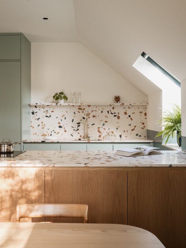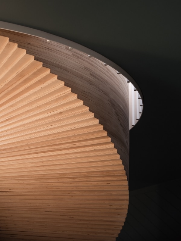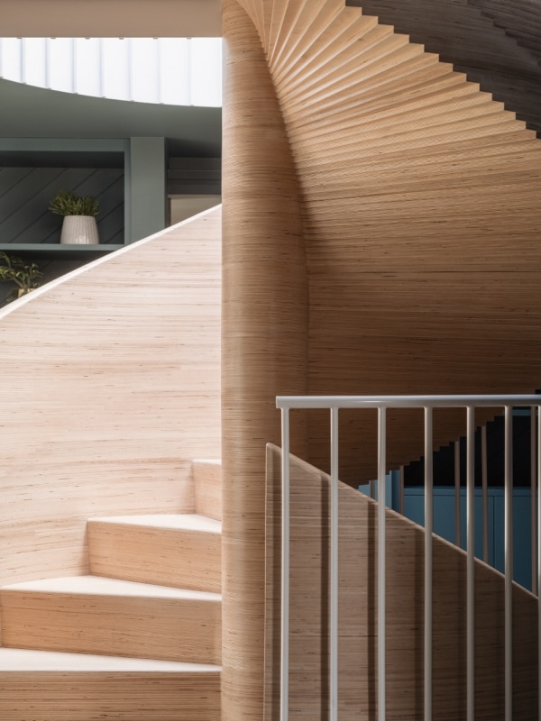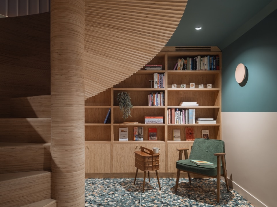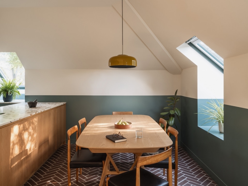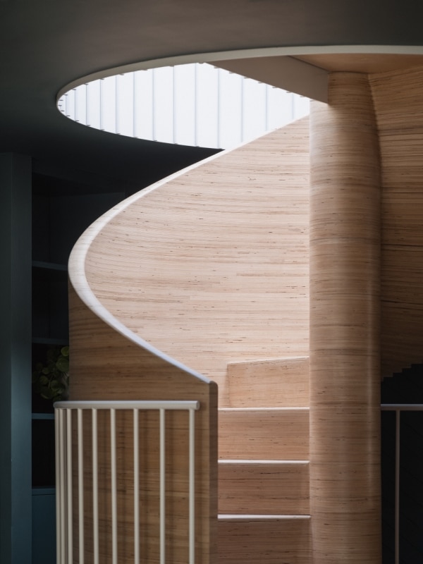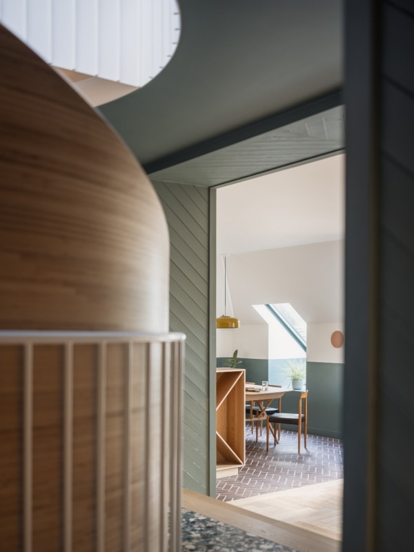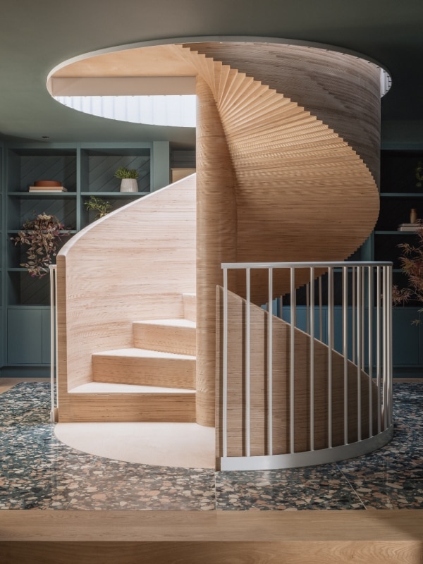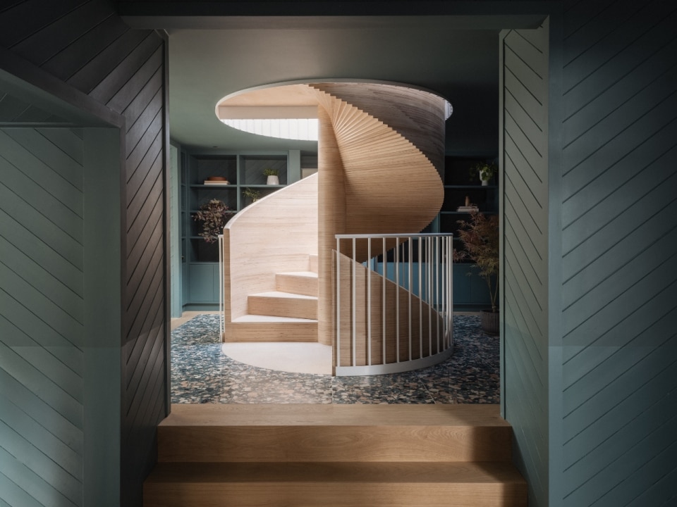In Milton Keynes, a town that emerged as part of the new town movement in the 1960s, a postmodern house has been given a new lease of life. This is Pyramid House, one of 36 experimental homes built for the 1981 Homeworld Expo. The site was used to test new models of living. Today, this iconic building has been completely renovated by Khan Bonshek. Respecting the pyramid’s geometry, which is as playful as it is complex, the project integrates energy efficiency and a clear reorganization of circulation. This transforms the fragmented layout into a sequence of interconnected spaces that are meticulously calibrated to make use of every last inch of floor area. The centrepiece of the renovation is the handcrafted wooden spiral staircase, which serves as the structural backbone and a well of light for the three floors organised (from top to bottom) into work, living and relaxation zones. Natural terrazzo finishes and light oak surfaces further enhance the spaciousness of the rooms.