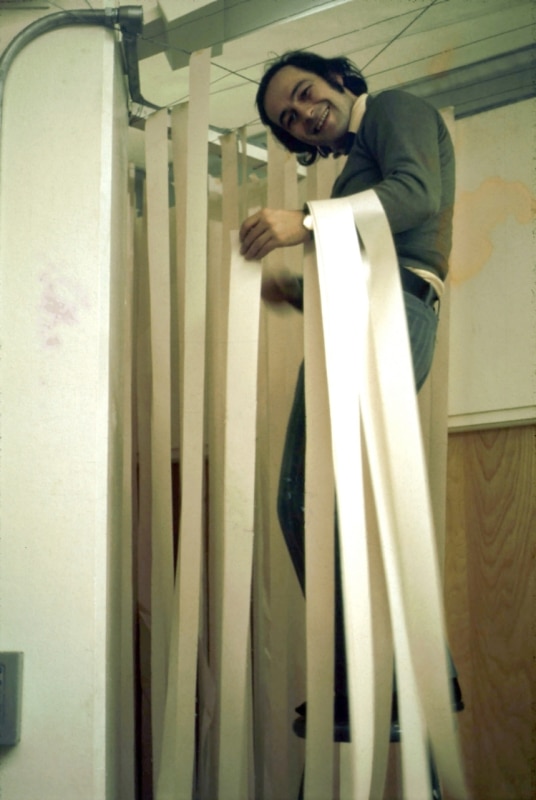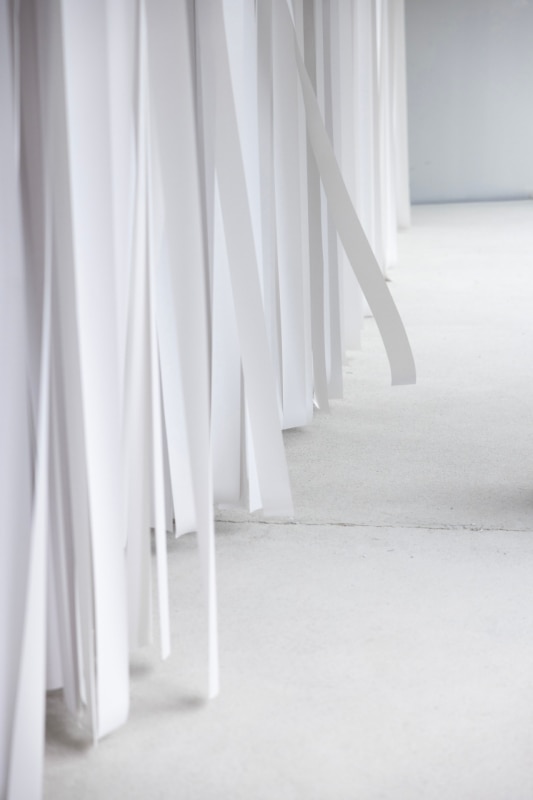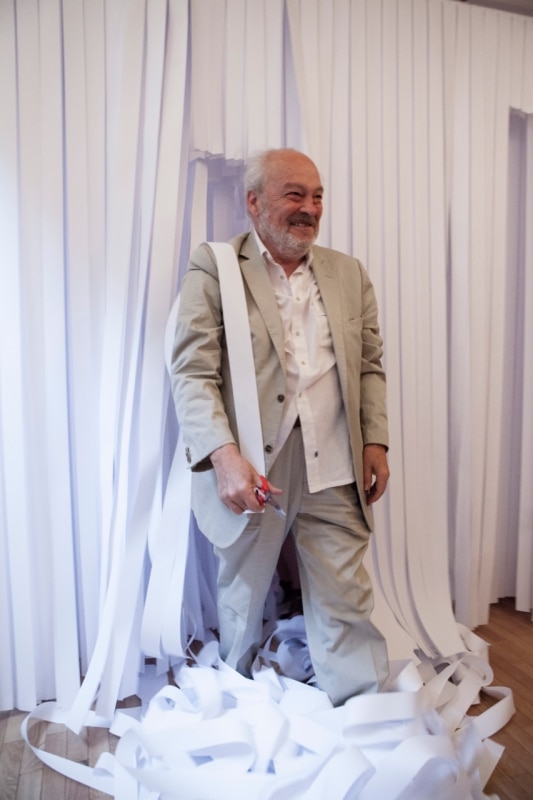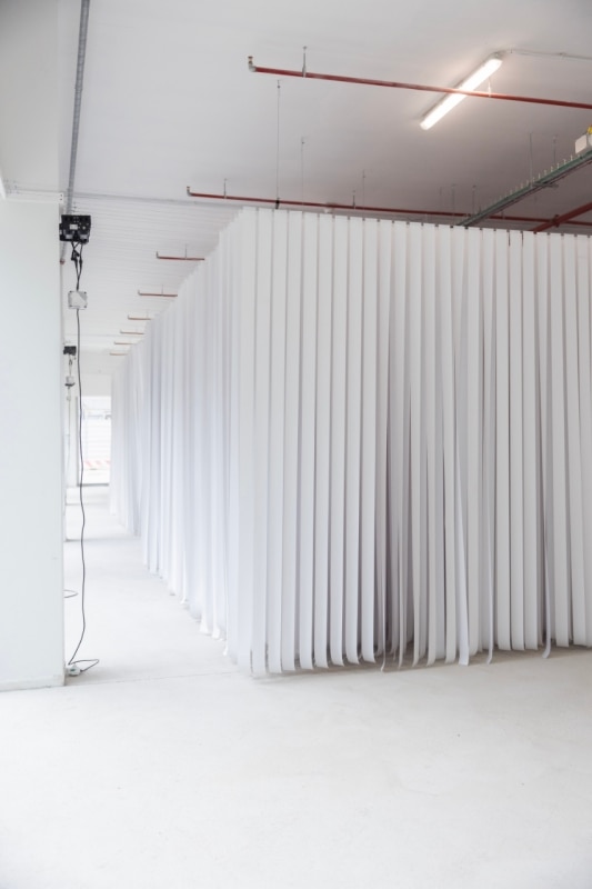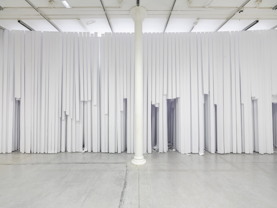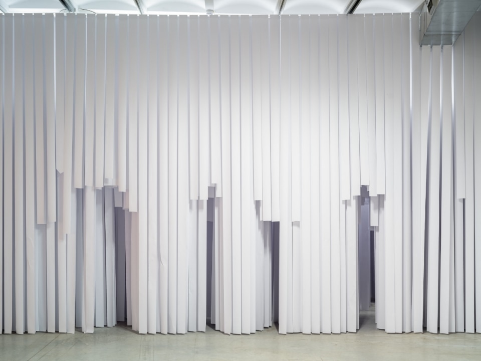 Paper strikes again. This time, it is the former industrial interiors at the heart of BiM, a major urban regeneration project in Bicocca, that are saturated with vertical strips of paper. And once again, the catalyst is Gianni Pettena, the self-styled “anarchitect,” who since the Florentine season of Radical Design – of which he was a key contributor – has looked more to art than to building.