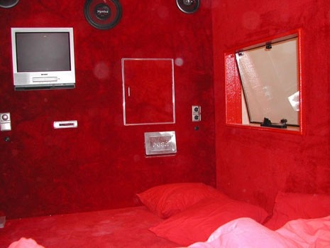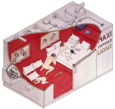 Rome they have set up their latest installation “Maxi Capsule Hotel Luxus”: a hotel room inspired by the Japanese capsule hotel built in wood and fibreglass. A 3.7 x 2.2m block, 2m high which puts forward ideas and functions for so called transitional spaces which differ from the usual: rather than anonymous and somewhat abandoned places they are made more intriguing with forms and colours which stimulate the senses, emotions and imagination. Founded in 1995 by Dutch artist Joep van Lieshout (then just 31 years old), the Atelier has worked with Rem Koolhaas on the design of the bar of the Grand Palais Convention Center in Lille and is now made up of around thirty artists, designers, architects, carpenters and consultants.