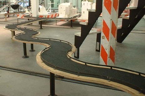 The installation, his first in Europe, fresh from a New York exhibition at the Bohen Foundation, covers 400 square metres with a long and tortuous track for model electric cars that winds around the sculptures, mechanical games and videos. And whilst the visitors move around, a closed circuit TV records their every move.