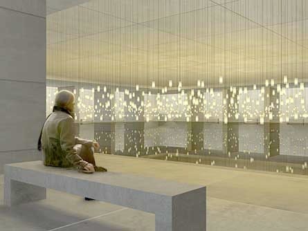 Inversion of Light by Toshio Sasaki includes a street-level landscaped park with a circular skylight that projects a blue light straight up from the location of the unidentified victim's remains