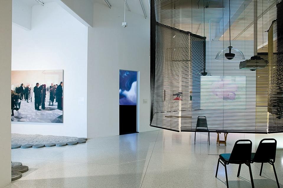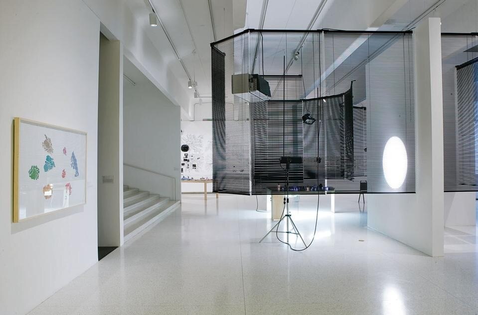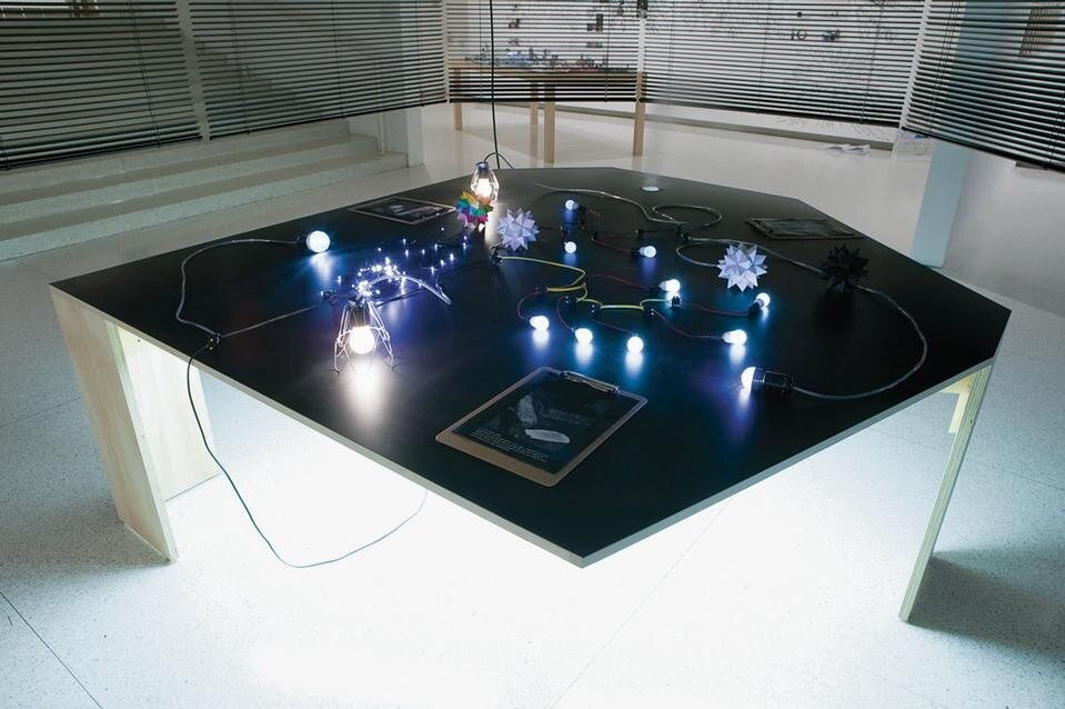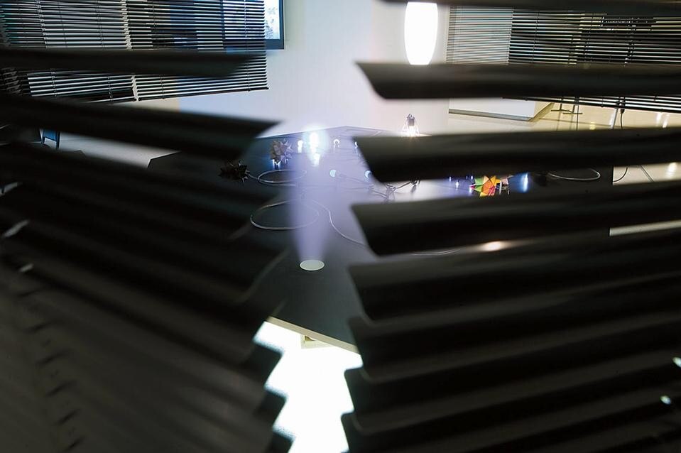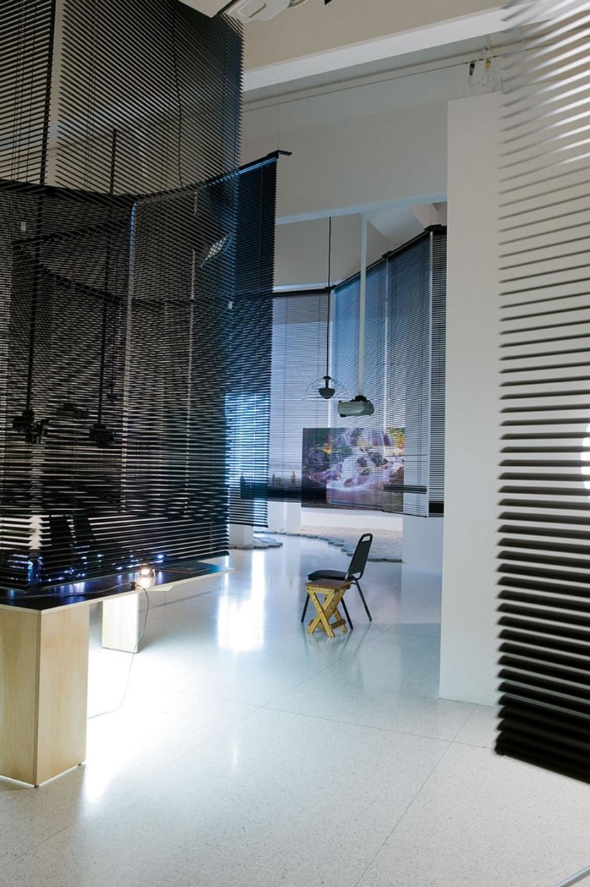 The doorway to Yang’s Blind Room is marked by visual and sensorial effects: the cool breeze from an air conditioner above the entrance, and a warm blaze emanating from an infrared heating lamp on the side. In front of us, a large white disc projected on the wall attracts our attention: an enormous spotlight has been set up, perhaps for those who desire to be watched or listened to, or maybe neither. In the adjacent room is a table with objects laid on it, surrounded by a pathway that allows us to take a closer look. An element of solitude permeates this area, as we understand before entering that the path is only wide enough for one person at the time. As a result, we must maintain a certain distance from both the person in front as well as the person behind. A bitter smell similar to burning tyres greets us as we enter the space, reminding us what revolting smells like. On the table, Yang has arranged a series of delicate light strands, a number of colourful pieces of origami in the shape of stars, and placed photocopies of photographs on clipboards for us to observe. A humidifier below the table creates a cloud of steam that rises steadily through a hole, turning the table into a miniature stage set for a tale that we have to invent. As we leave the space we are offered one last scent, but this time we recognise the undeniably familiar smell of clean laundry. The objects in Yang’s custody are never arbitrary or solely material symbols. In her concept of social relations, light, heat, smell and sound are tangible forms coded with image value and charged with the nobility of having more than one function. One of Yang’s recurrent objects, the light bulb, takes on a referential status through its “behaviour” in shadowy spaces, ranging from bold autonomy to shy reclusion. These objects of light vary in scale, colour and voltage, for she is not only seeking illumination but also the gesture of presence to be enacted in a given space. On the table in Blind Room she offers groupings of two, four and six lights in the form of constellations, but together they constitute a single white light that twitches energetically in complete anarchy, blinking for its own sake. Another reappearing object in Yang’s lexicon is the Venetian blind. These blinds split and reconcile space by affirming and denying light. In Yang’s cosmos they function as a surrogate for perception, pointing to the subjectivity of seeing. As the artist has stated, “I’m fascinated by the blind and its function of filtering light and creating a kind of half-transparent wall between two spaces. It is that space between people that I’m very interested in. You are not alone. You can see other people walking through the half-shadow, half-light. You are sharing but not sharing” (in “Artist Haegue Yang at Redcat” by Lynne Heffley, Los Angeles Times, 16 July 2008). In Blind Room, lights and blinds mark moments of transition but also transactions, abstracting social relations between the “I” and the “You” into discreet coexistences, simultaneously suggesting proximities and distances, and playfully teasing us into being and not being.