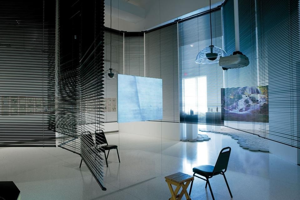 This process of observation and alteration is also present in the manner in which Yang constructs space. Concentrating on the most precarious of details, she has made the condition of ephemerality a central aesthetic principle of her practice. In the installation Series of Vulnerable Arrangements – Blind Room, 2006-2007 (in the exhibition “Brave New Worlds” at the Walker Art Center in Minneapolis), which serves as a viewing space for the video trilogy, she conceived an indoor pavilion that conceals as much as it reveals. Made from dozens of black Venetian blinds that have been rolled down to their full length, these horizontal lines divide the space into four enclosures. Slightly titled at 60 degrees, the shades let less than half the light filter through. The blinds’ overall layout follows a precise diagram that appears to take its shape from the creases left on a piece of paper previously used for origami, as mountain folds and valley folds repeat throughout the space. Fronts and backs, positives and negatives are played against each other to form a moiré of lights and shadows. Thresholds between each blind allow light to filter through vertically, while the open space below makes visible its interior: a quartet of chairs and stools, a table, electrical cables, and two freestanding lamps.