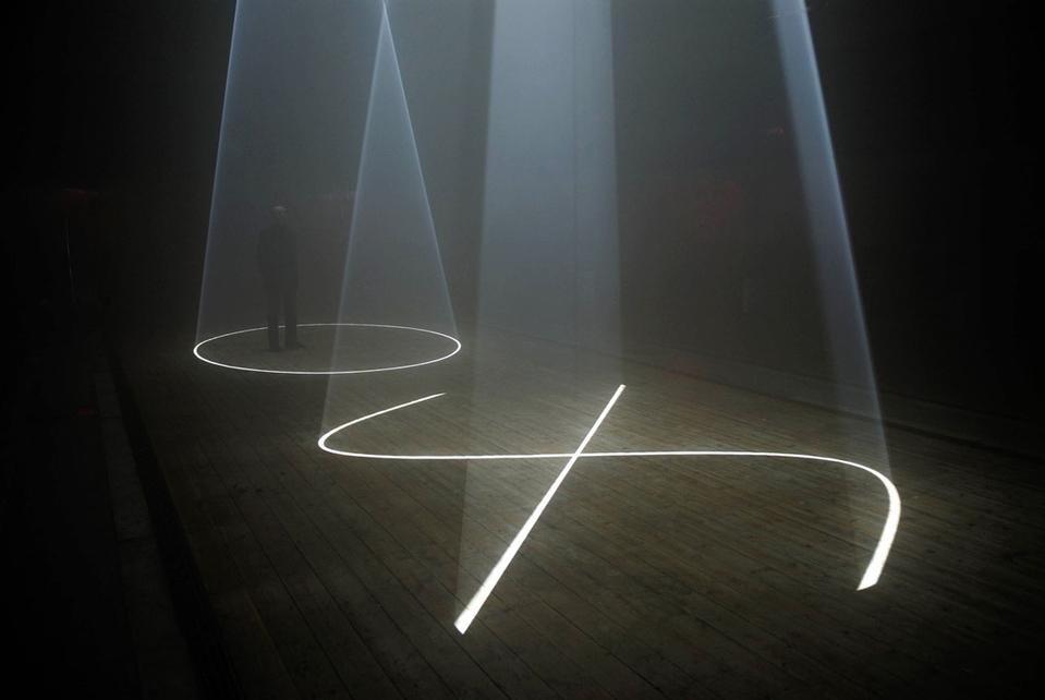 Light sculptures by British artist Anthony McCall illuminate the huge industrial space at the Hangar Bicocca.