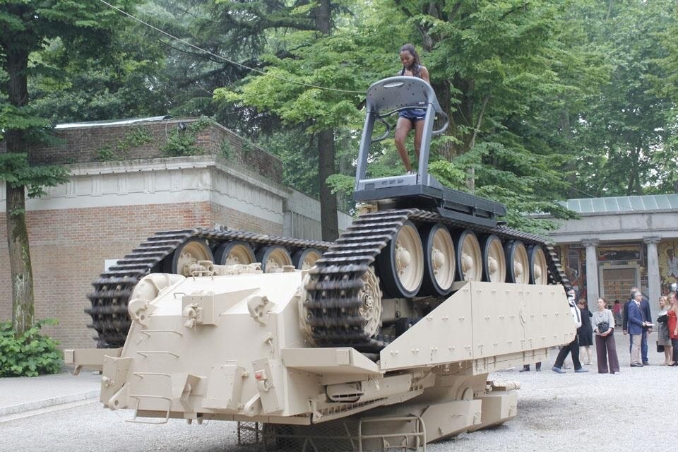 The first is provided by the United States pavilion, which rises prominently at the end of the main path in the Giardini. Its artist, the Puerto Rican-born duo Allora & Calzadilla, announce their presence from the outside of the building with a spectacular installation consisting in an upturned tank topped with a treadmill. The tank comes to life once an hour as its tracks turn idly and noisily and a man with an athletic physique runs on the treadmill for a few minutes. Not far away is the Great Britain pavilion, rendered unrecognisable by Mike Nelson, who has created inside it a maze of tiny unkempt rooms, cubby holes and wooden stairs. The whole opens onto a small patio and evokes Istanbul but also Venice—albeit a very different Venice from that acting as a backdrop to this Biennale. Everything in this microcosm speaks of nostalgia, abandon, poverty and want.