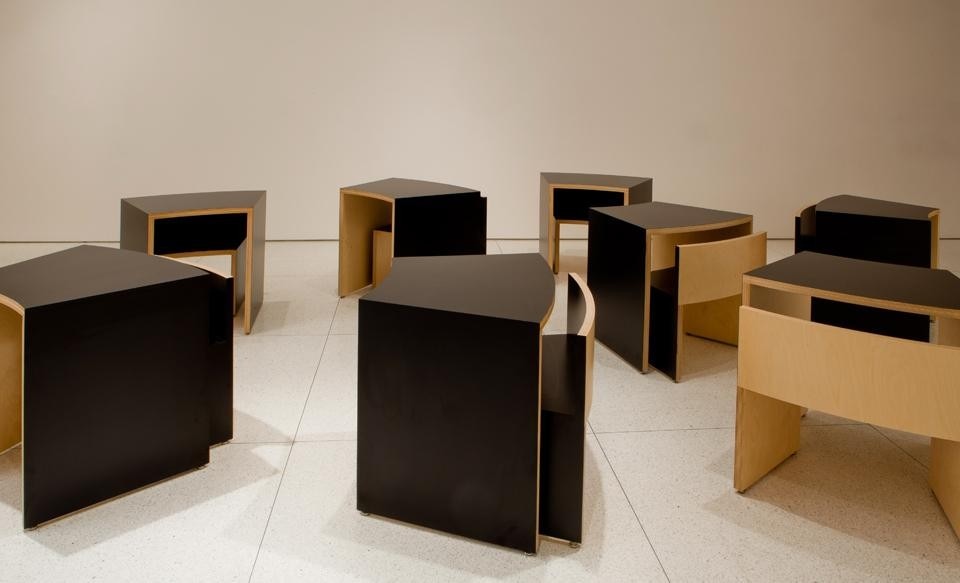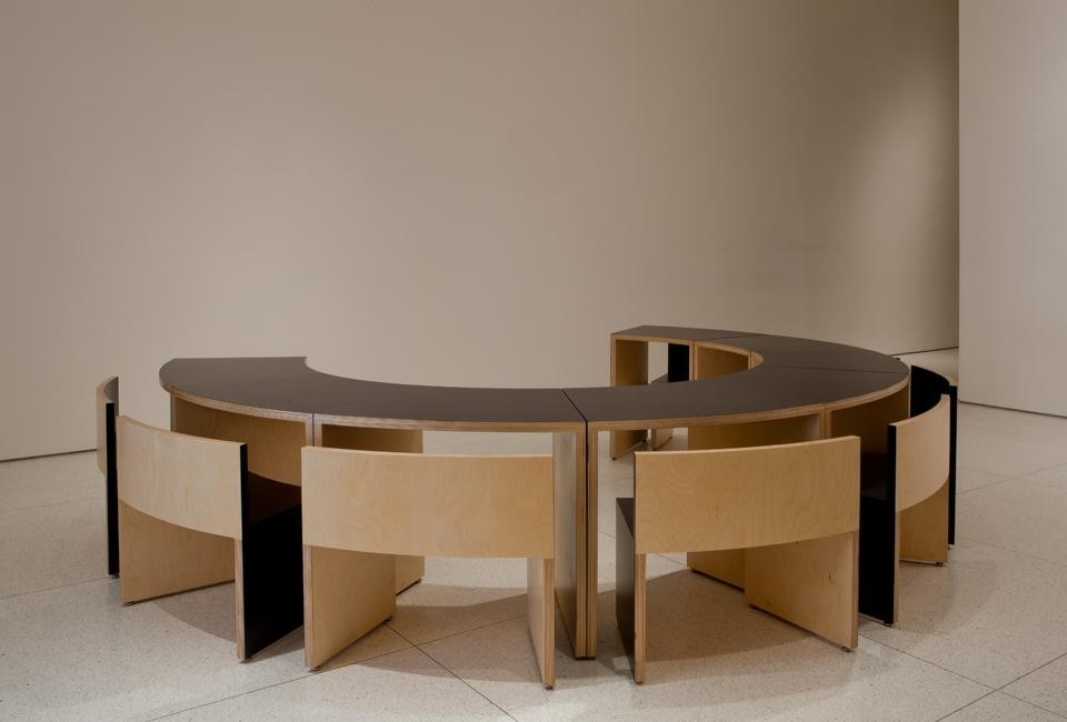 Simon Dance of Simon Dance Design was invited to be involved in the collaboration last September. His initial ideas for the table and chair's geometry and configuration were inspired in part by Ken Adam's table for the Stanley Kubrick film Dr Strangelove, the bar scene in his film The Shining and the set design of 2001 a Space Odyssey, as well as the Greek theatre Epidaurus at Argolis, and a table designed for diplomatic negotiations. Design sketches and study model options were evolved through a number of stages and inspirations, including Shaker furniture, Sol Le Witt, AG Fronzoni, Donald Judd, Gerrit Rietveld, Charles Rennie Mackintosh — getting all the archetypes "out of the way". "Good design is about understanding what went before and learning from it", he says.
