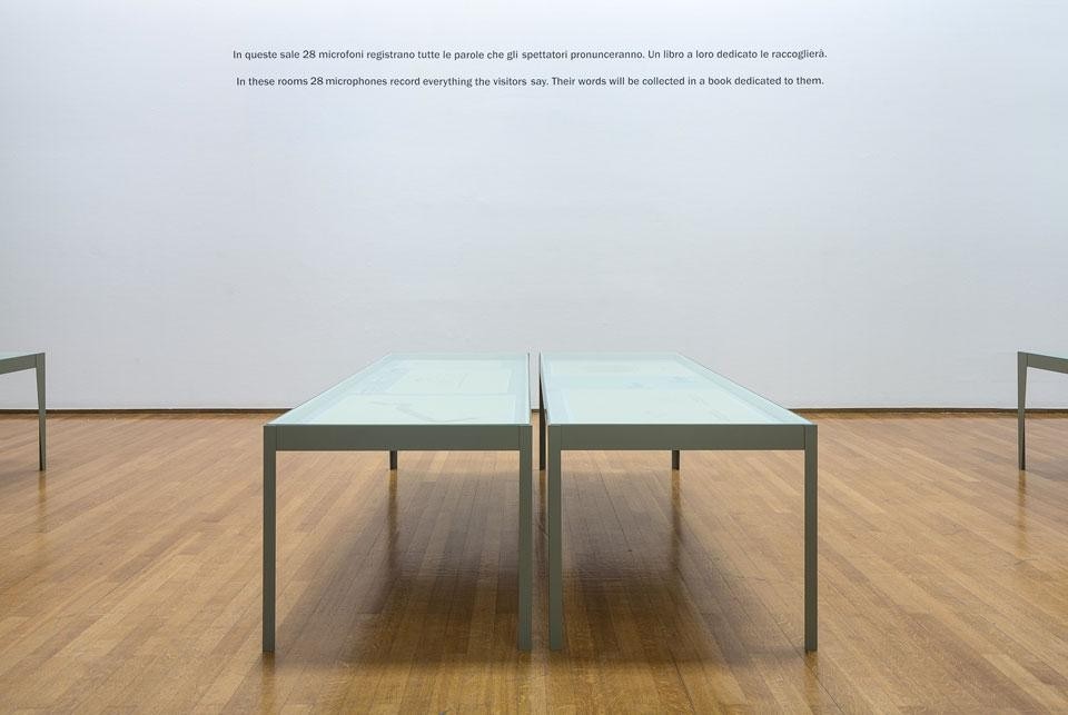The microphone piece is the key work in the exhibition, asking the viewer to assume responsibility for his role. It is a work that modifies their behaviour, it can become a performance, taking the idea of the present into it, updating the old works. When they write about my work, very often they dwell on the most superficial aspect, the seemingly sentimental one. In reality every public work is based on a methodology that applies the notion of there being two sides to the coin.