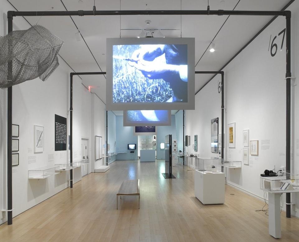 The premise of Materializing "Six Years" — to assemble the works that were arrayed in Lippard's book — might seem odd. After all, given that the specific focus of this documentary project was that its various subjects were united by the state of their "dematerialization" — isn't it slightly perverse to, forty years after the fact, arrange for the works (or their representative documentation) to neatly — even preciously — materialize?