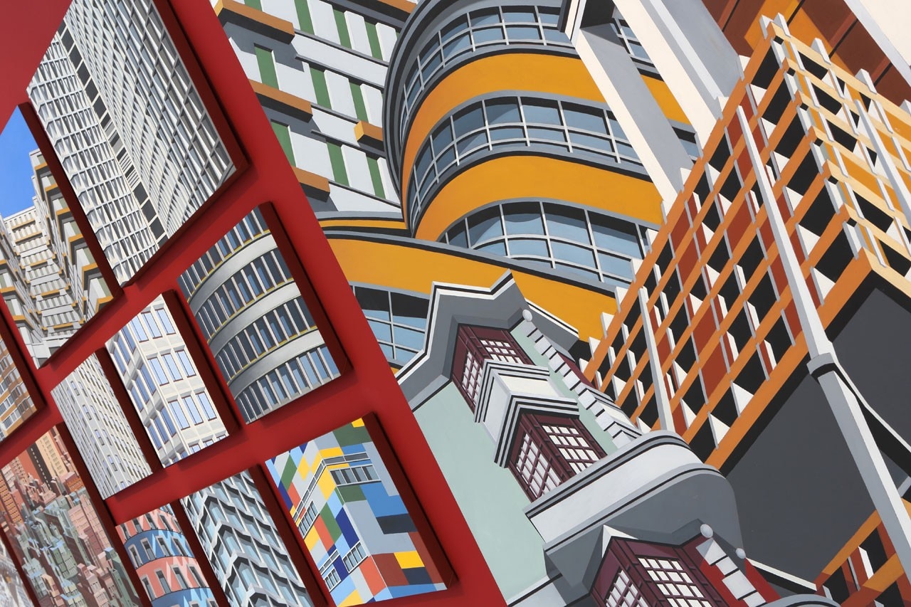 The metropolitan atlas in the exhibition begins on a large wall conceived as a gallery of Petrus’ work. All the artist’s types and angles are set against an oxide red backdrop – a distinctive cipher of his work that can be seen on the bases and edges of his canvases: the upward-looking views, the architectural montages, the back-to-front views of buildings (the so-called Upside Downs) and the jumbled up and imaginary compositions of overlapping buildings forming a sort of urban collage. Opposite is the panoramic series in a new 100x200 cm format, adopted for the first time, of the newest buildings: the new Palazzo della Regione, the Unicredit tower in Milan and Zaha Hadid’s building in Marseille. All follow the thread of a pictorial story that could almost be a film. “I do not really want to convey the identity of one city rather than another – says Petrus – but to seek an artistic identity. I look to architecture as a model that will inspire me.” The architecture that simply and genuinely gives Petrus “an excuse to paint.”