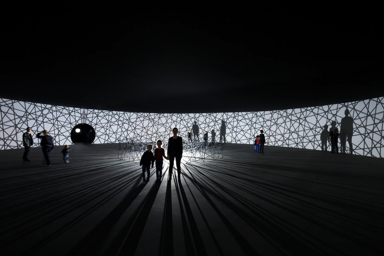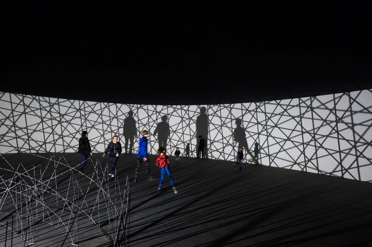 The space containing the exhibition thus becomes a relic and already the ruins of this museum can be contemplated, the immaculate whiteness of its Ductal cement being simply a phantasmatic presence. We see it reflected now and again in the spheres that look however like convex planes. This is the reticulated “map for unthought thoughts”, in which the presumed sphericity of the walkable space is revealed as a play of mirrors; and we ourselves become a reticulum, or rather, nothing more than reticulated shadows interacting with the surrounding space – almost like Giacometti figures projected into an image of science fiction. Cosmic existentialism, underscored by the unexpected arrival of a semispherical ground, perceived by one’s feet as the crust of a planet. An eclipse is in progress, reinforced by the passage of a light that cuts our horizon exactly as if another star was passing by. Paradoxically, we are walking in an indefinable space. Eliasson supplies us with a model of space.