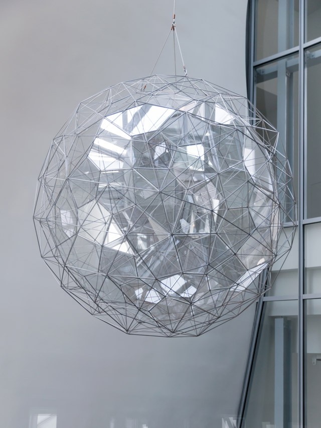 And so the eclipse is completed by an external circumnavigation of the grotto inside the horizon, where a sound installation by Samuli Kosminen and Eliasson himself echoes the sounds perceived within the exhibition. Again outside, in the search for an everlasting return, suspended in the heart of Gehry’s architecture is Dust particle, a glass sphere waiting for a tracer installed on the roof of the building to receive sunlight and intermittently to illuminate the museum hall. In the absence of that sunlight we can only seek consolation in the ecosustainable lamp named Little Sun, designed by Olafur Eliasson, a limited edition of which has been created for the occasion and is on sale in the museum shop.
