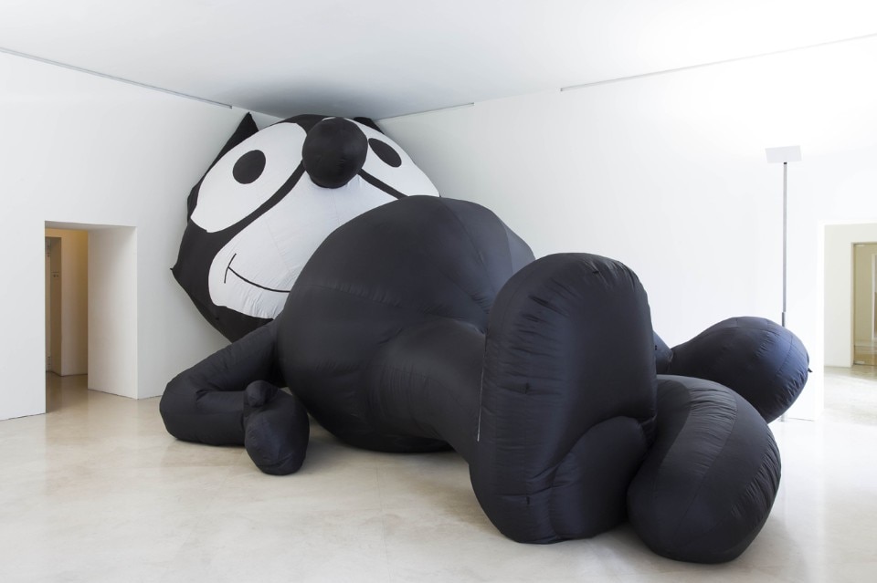 The exhibition prologue is dedicated to a recurring protagonist of Leckey’s works, the black and white cartoon cat Felix, present here in the form of a balloon sculpture (Inflatable Felix, 2013).