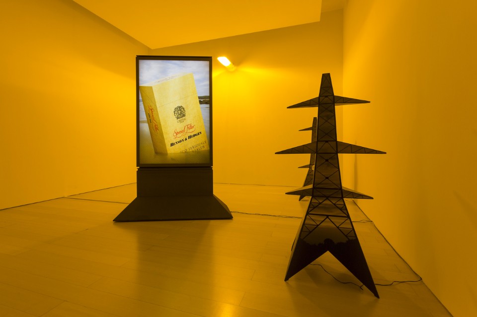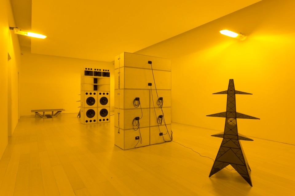 These spaces are dominated by the Sound System installation (2011–2012), which returns the focus to the centrality of music and Leckey’s operational model of the DJ set, and are illuminated by orange motorway lights.