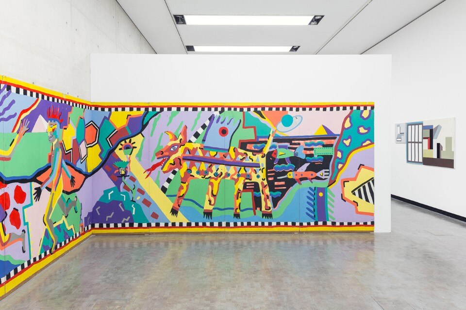 You feel like spending a long time in this exhibition, retracing your steps, sitting on one of the coloured benches shaped like a cassette, resting your bare feet on one of the beautiful carpets. You want to stay in this world, to continue to breathe this mixture of joy and sadness and try to decipher the magic of such abundant talent, to let yourself be seduced by a use of marks and colours that you could become addicted to. But you also want quietly to stop there and do you own thing, read a book, practice yoga, listen to music, stay and chat with a friend sitting on the sofa. Maybe you could…
