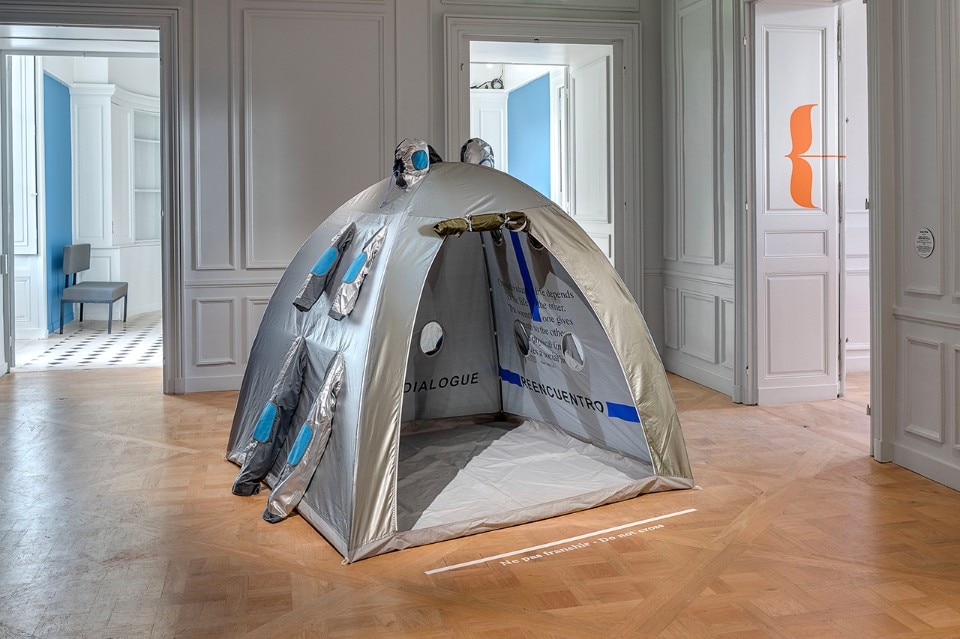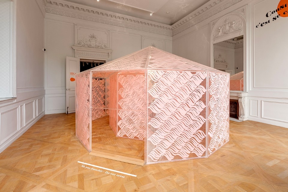By metonymy, woman becomes the home she embodies. The section “Empreints” (“Traces”) is highly poetic. It speaks of absence, the places of the lost soul, and of the body. Here is the work of Nazgol Ansarina, who recreates a wall destroyed in Tehran. Isa Melsheimer recreates a rooftop garden designed by Le Corbusier for Charles de Beistegui in the 1920s: a space with walls just 1.50 metres high, near the Champs-Élysées.