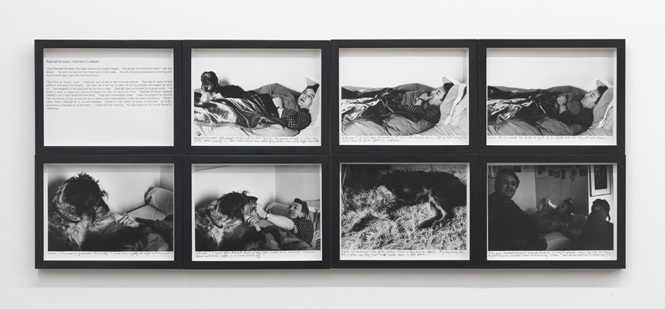 Sophie Calle, The Sleepers—Raphael Brossard, 1980. 7 black and white photographs, 1 text, Edition of 5, each photograph 5 7/8 x 7 7/8 in. Courtesy of Galerie Perrotin, Paris/New York