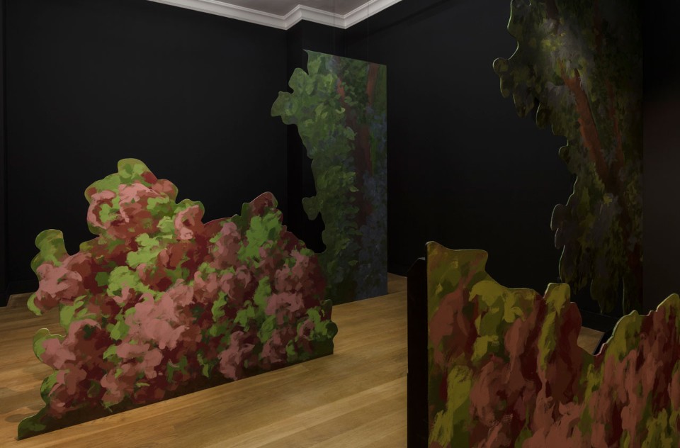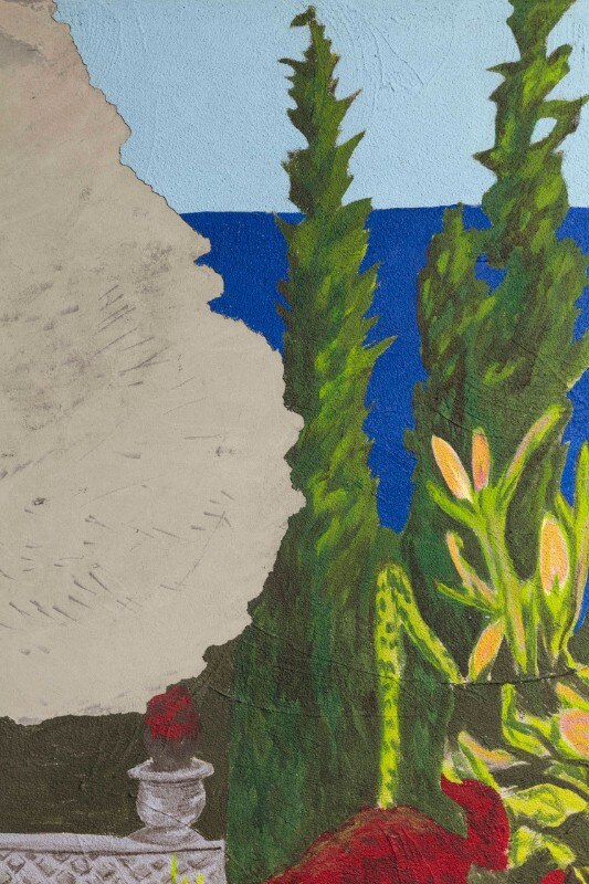 Let’s imagine the existence of a garden, a garden of memory and magical, like in 1001 Arabian Nights, recreated – nonetheless – inside a museum, the Villa Sauber at the Nouveau Musée National in Monaco, which will soon close for restoration. A romantic garden. Let’s also imagine that our gazes as spectators cross, like in a spell, in the rooms while admiring the 40 painted panels that create a unique atmosphere and reference the landscape and architecture motifs of decors by Alphonse Visconti, the head decorator of the Opera in Monte Carlo between 1903 and 1924.