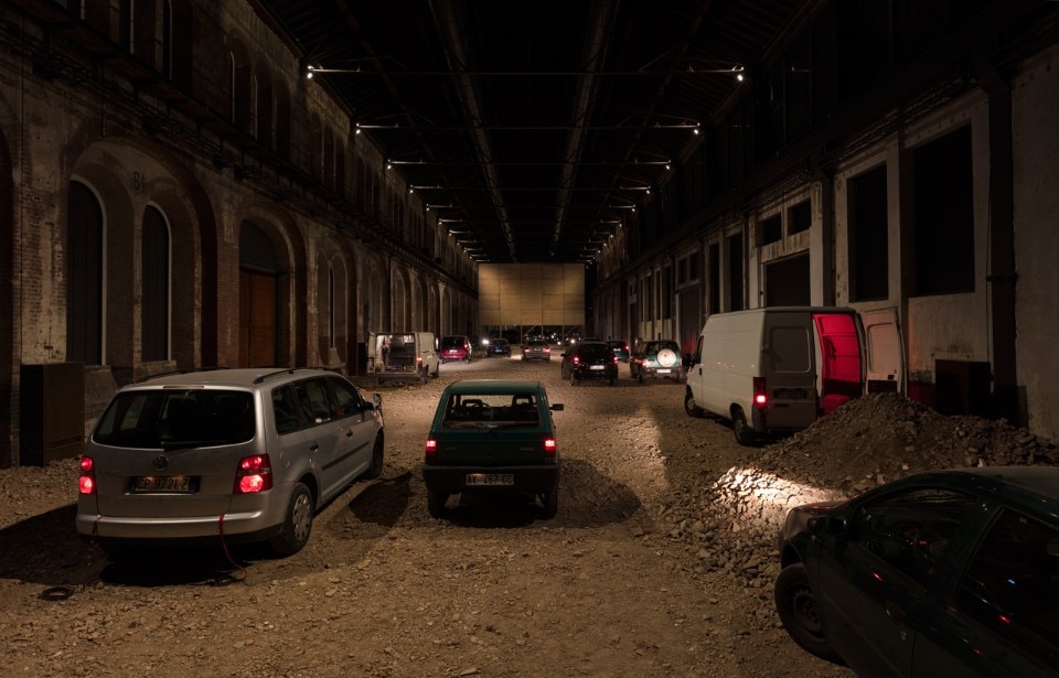 A huge wooden structure creates a threshold for Binario 1 room, to a dark landscape where 20 abandoned cars are parked on smashed debris. Through a general reduction of light and sounds, Nelson models a physical and emotional limbo drawing its substance from Michelangelo Antonioni and Dario Argento or artist Ed Kienholz.