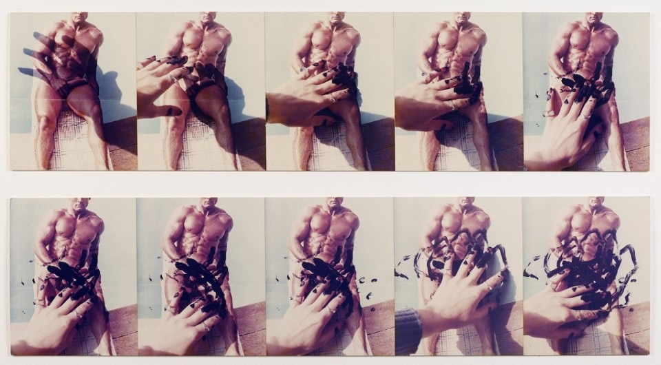 In one of her most famous photographic works using a time-lapse sequencing rules, Approach to Fear: Paid – Destruction of the Cause (1977), the high-heeled shoe (an icon of women’s oppression in the 1970s) is set alight and rendered unwearable. In another work from 1976, a photograph of a naked, muscled man is defaced by a hand, that of the artist, smearing a treacle-coloured substance that obliterates the phallus while stroking it.
