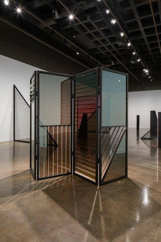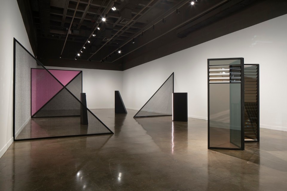 Kapwani Kiwanga’s recent work traces the impact of colonialism and its pervasive legacy by considering historical narrative and the archive. Her work is research-driven, instigated by marginalized or forgotten histories, and articulated across a range of materials. At the core of her exhibition at the List Center is an engagement with racialized surveillance and the systems used in monitoring and controlling the movement of bodies in space. Kiwanga follows the lineage of surveillance and positions it in relation to blackness in America, from its roots in slavery to the role that technology performs today. For instance, Jalousie (2018) juxtaposes the familiar uses of two-way mirrors in interrogation rooms and corporate settings with angled slats, referencing the ubiquitous domestic window shutters found in homes from tropical climates to New England. Both material and design pose the shifting of power depending on one’s position. Reflected in the two-way mirror of Jalousie are partitions created from shade cloth, an agricultural textile used in large-scale industrial farming around the world.