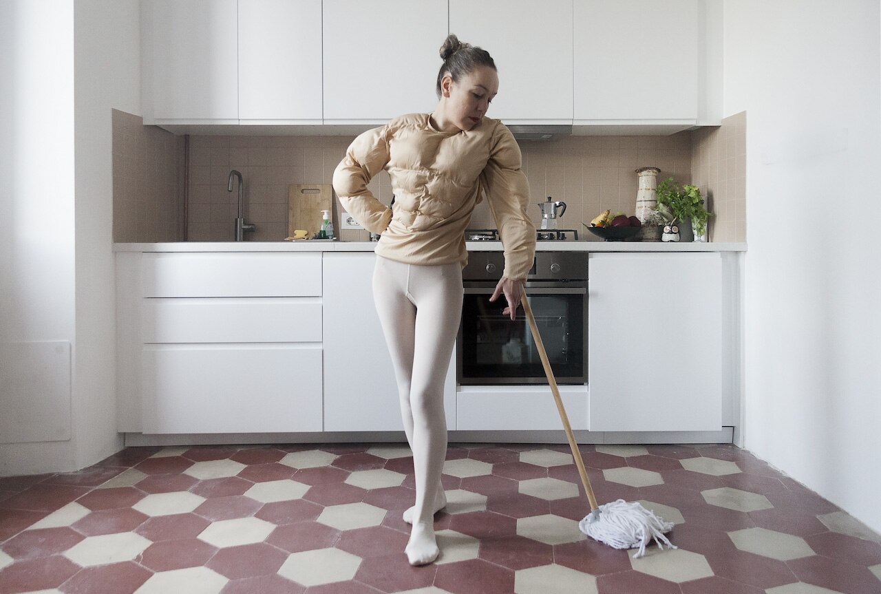 Dressed in white, with a flesh-coloured top and a breast-piece reproducing the muscular torso of a Greek-Roman statue, Marianne presented herself as a guide, complete with microphone. She read and interpreted, with gestures that varied from the calm tones of a guide, through irony, right up to those of a rock star. A stunning and complex piece. What was striking in this highly studied performance was that the artist kept her wedding ring on, and it was no mere oversight. In the invitation, Heier is shown photographed in front of a kitchen in a pose vaguely reminiscent of Charlie Chaplin, resting on a broom. I believe that the idea was to recall the 70s feminist slogan: “The personal is political”.